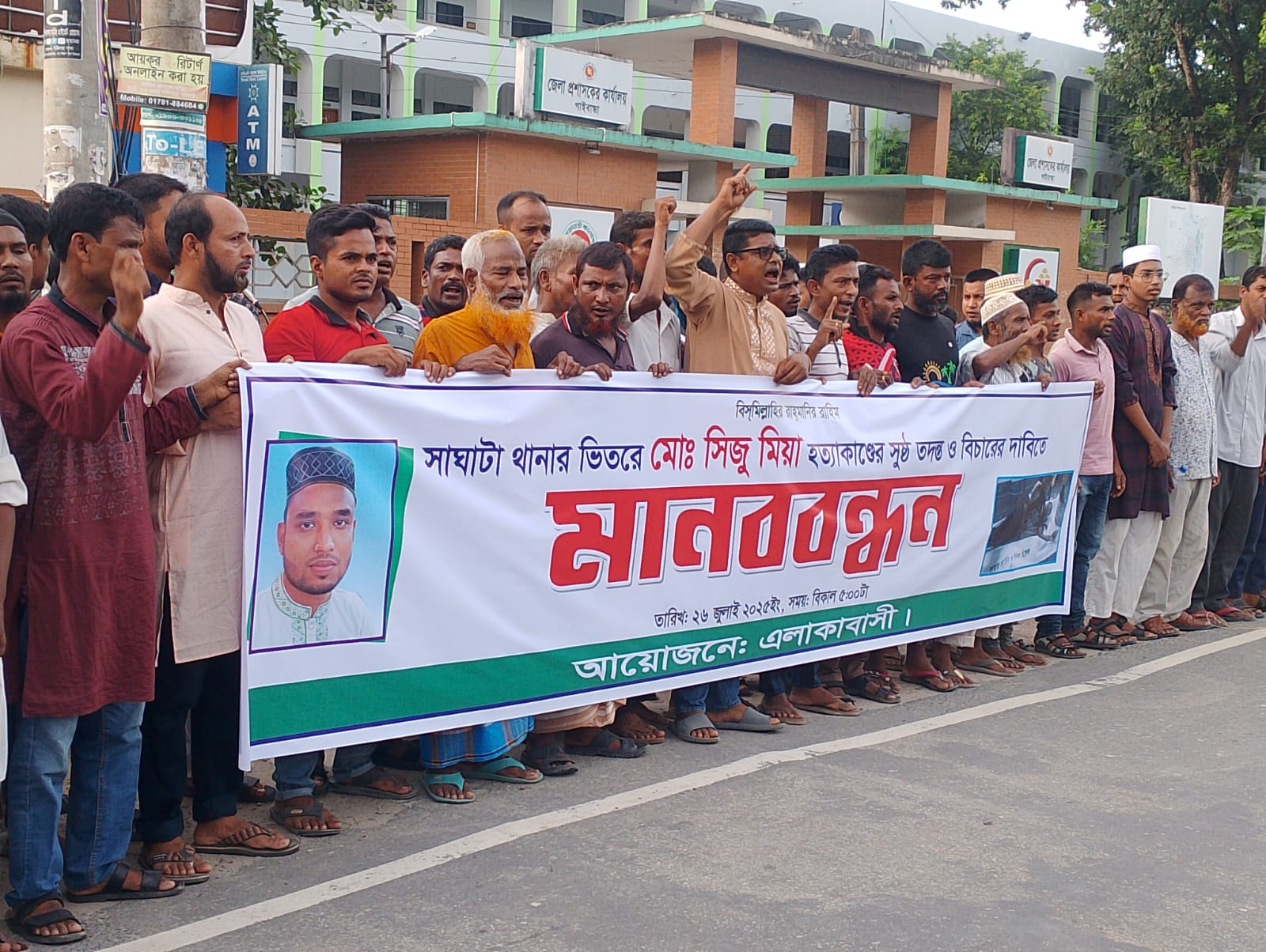 মো: জাহিদ হাসান জিমু,গাইবান্ধা : গাইবান্ধার সাঘাটা থানার ভেতরে মো: সিজু মিয়া হত্যাকাণ্ডের সুষ্ঠু ও নিরপেক্ষ তদন্ত এবং বিচারের দাবিতে মানববন্ধন ও বিক্ষোভ সমাবেশ অনুষ্ঠিত হয়েছে।শনিবার (২৬ জুলাই ২০২৫) বিকাল ৫টায় গাইবান্ধা জেলা পুলিশ সুপার কার্যালয়ের সামনে এলাকাবাসীর ব্যানারে এই কর্মসূচি পালিত হয়।মানববন্ধনে অংশগ্রহণকারীরা বলেন, থানার মতো একটি নিরাপদ স্থানে একজন নিরপরাধ ব্যক্তির মৃত্যু ন্যায়বিচারের প্রশ্ন তোলে। তারা অবিলম্বে নিরপেক্ষ তদন্ত, দোষীদের শাস্তি এবং নিহত সিজু মিয়ার পরিবারের নিরাপত্তা নিশ্চিত করার আহ্বান জানান।মানববন্ধন শেষে একটি বিক্ষোভ মিছিলও বের করা হয়।এ সময় উপস্থিত ছিলেন এলাকার গণ্যমান্য ব্যক্তি, স্বজন, যুব সমাজসহ শতাধিক মানুষ। তারা বিচার চাই সিজু হত্যার বিচার চাই” ইত্যাদি স্লোগান দেন।