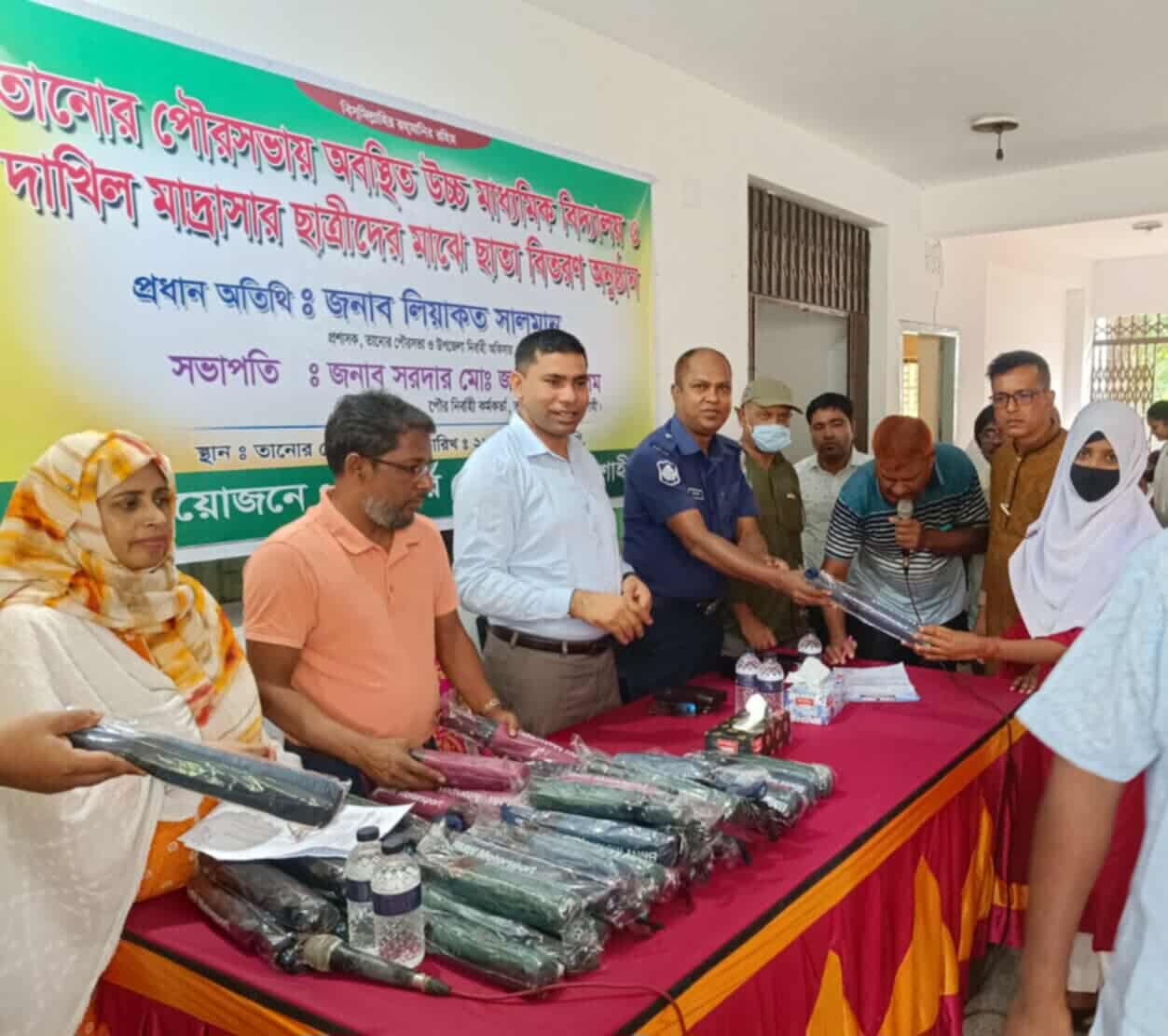 সোহানুল হক পারভেজ রাজশাহী বিভাগীয় প্রধান : রাজশাহী তানোরে বিভিন্ন শিক্ষা প্রতিষ্ঠান শিক্ষার্থীদের মাঝে ছাতা বিতরণ করেন তানোর পৌরসভার প্রশাসক ও উপজেলা নির্বাচন অফিসার লিয়াকত সালমান। তারোর পৌরসভার আয়োজনে গতকাল সোমবার সকালে তানোর পৌরসভার কার্যালয়ে শিক্ষার্থীদের মাঝে ছাতা বিতরণ অনুষ্ঠান অনুষ্ঠিত হয়। তানোর পৌরসভা সহকারী প্রকৌশলী ও ( ভারপ্রাপ্ত) পৌর নির্বাহী কর্মকর্তা সরদার মো: জাহাঙ্গীর আলমের সভাপতিত্বে প্রধান অতিথি হিসেবে উপস্থিত ছিলেন উপজেলা নির্বাহী অফিসার ও তানোর পৌরসভার প্রশাসক লিয়াকত সালমান। এ সময় উপস্থিত ছিলেন তানোর উপজেলা স্বাস্থ্য কর্মকর্তা বননাবাস সাজদা, তানোর থানার অফিসার ইনচার্জ (ওসি) আফজাল হোসেন, উপজেলা প্রাথমিক শিক্ষা অফিসার আলেয়া ফেরদৌস, উপজেলা সমাজসেবা কর্মকর্তা মোহাম্মদ আলী খান তারের পৌরসভার কর্মকর্তা আব্দুল সবুর, মাহাবুরসহ পৌরসভার কর্মচারীরা ও বিভিন্ন শিক্ষা প্রতিষ্ঠানের শিক্ষার্থী ও শিক্ষকরা উপস্থিত ছিলেন। তানোর পৌর এলাকার উচ্চ মাধ্যমিক ও দাখিল মাদ্রাসা মোট ৯১০ জন শিক্ষার্থীদের মাঝে ছাতা বিতরণ করা হয়।