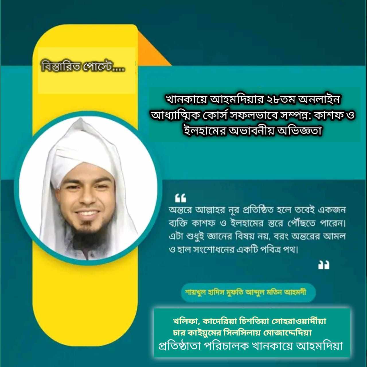 খানকায়ে আহমদিয়া সম্পর্কে সংক্ষিপ্ত পরিচিতি: ২০১২ সাল থেকে পরিচালিত খানকায়ে আহমদিয়া একটি সুপ্রতিষ্ঠিত আধ্যাত্মিক প্রতিষ্ঠান। এটি দীর্ঘদিন ধরে কাশফ, ইলহাম এবং আত্মশুদ্ধির পথপ্রদর্শক হিসেবে কাজ করে আসছে। বাংলাদেশ ছাড়িয়ে আন্তর্জাতিক পর্যায়েও প্রতিষ্ঠানটি আধ্যাত্মিক অভিজ্ঞতা ও প্রশিক্ষণের নির্ভরযোগ্য ঠিকানায় পরিণত হয়েছে।