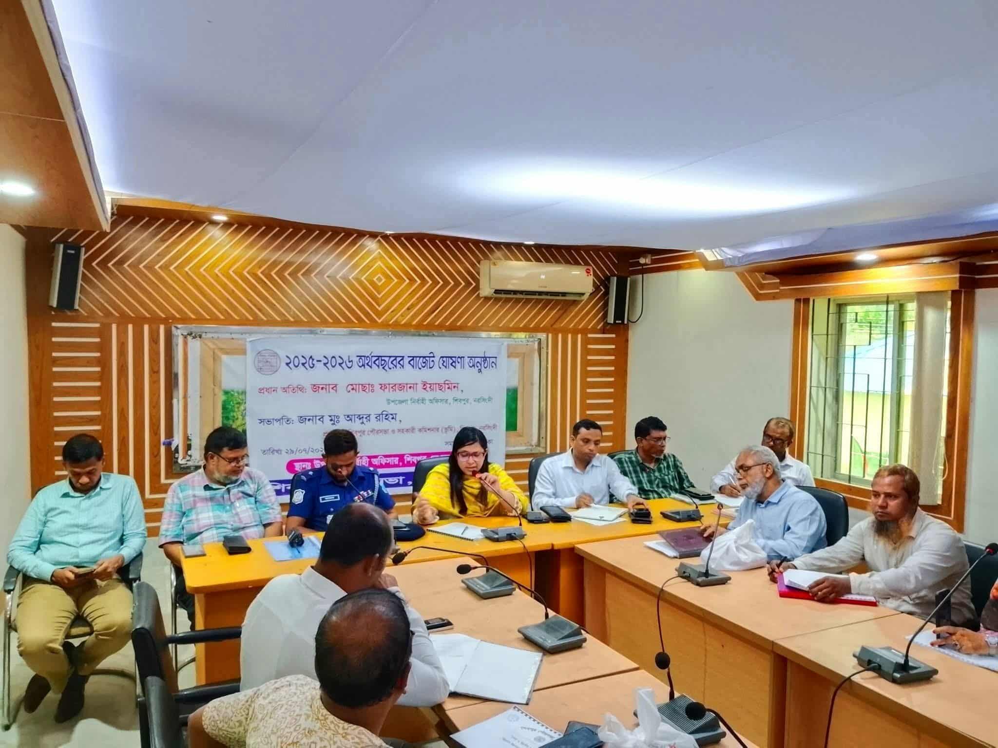 নরসিংদীর শিবপুর পৌরসভার ২০২৫-২০২৬ ইং অর্থবছরের বাজেট ঘোষণার আয়োজন করা হয়েছে। অদ্য ২৯ জুলাই মঙ্গলবার সকালে ১১ টায় শিবপুর উপজেলা পরিষদ এর সম্মেলন কক্ষে অনুষ্ঠিত এ বাজেট ঘোষণা করা হয়। বাজেট ঘোষণা অনুষ্ঠানে প্রধান অতিথি হিসেবে বক্তব্য রাখেন উপজেলা নির্বাহী অফিসার (ইউএনও) মোছাঃ ফারজানা ইয়াসমিন। অনুষ্ঠানে সভাপতিত্ব করেন শিবপুর পৌরসভার প্রশাসক ও সহকারী কমিশনার (ভূমি) মু, আব্দুর রহিম।এছাড়াও উপস্থিত ছিলেন শিবপুর মডেল থানার অফিসার ইনচার্জ মোহাম্মদ আফজাল হোসাইন, শিববপুর উপজেলা প্রকৌশলী খোন্দকার গোলাম শওকত, শিবপুর উপজেলা স্বাস্থ্য ও পরিবার পরিকল্পনা কর্মকর্তা ডাঃ মোশতানসির বিল্লাহ । উপজেলা বিভিন্ন সরকারি দপ্তরের কর্মকর্তারা বৃন্দ। অনুষ্ঠানে পৌরসভার বিভিন্ন উন্নয়ন কর্মকাণ্ড, রাজস্ব আয় ও ব্যয়ের খাতসহ ভবিষ্যৎ পরিকল্পনা তুলে ধরা হয়। বাজেট ঘোষণার মাধ্যমে পৌর নাগরিকদের জীবনমান উন্নয়ন ও পৌরসভার অবকাঠামোগত উন্নয়নের প্রতিশ্রুতি ব্যক্ত করেন শিবপুর পৌর প্রশাসক।