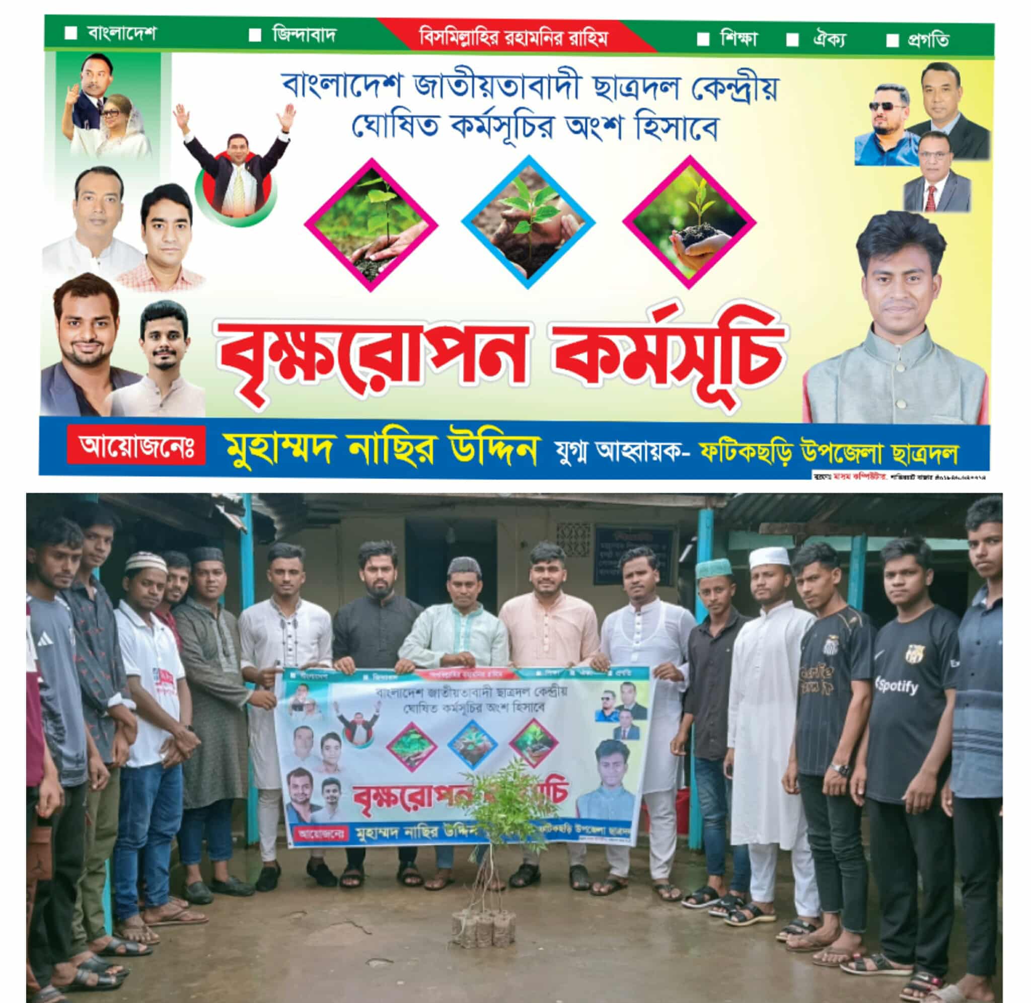 ফটিকছড়ি প্রতিনিধি: সবুজে মোড়া স্বপ্নের ফটিকছড়ি’ এই স্লোগানকে সামনে রেখে বৃক্ষরোপন কর্মসূচীর উদ্বোধন করেছে ফটিকছড়ি উপজেলা ছাত্রদল। ছাত্রদলের কেন্দ্র ঘোষিত কর্মসূচির অংশ হিসেবে ফটিকছড়ি উপজেলা ছাত্রদলের যুগ্ম আহ্বায়ক মুহাম্মদ নাছির উদ্দীনের সভাপতিত্বে ও ২নং দাঁতমারা ইউনিয়ন ছাত্রদলের সাধারণ সম্পাদক মোঃ শাহেদুল আলম চৌধুরীর সঞ্চালনায় বৃক্ষরোপণ কর্মসূচিটি অনুষ্ঠিত হয়। এতে উপস্থিত ছিলেন, ৪নং ভূজপুর ইউনিয়ন ছাত্রদলর সিঃ সহ সভাপতি,এস.এম হোসাইন,সাধারণ সম্পাদক, মোঃ ইলিয়াছ বাঁচা,৩নং নারায়নহাট ইউনিয়ন ছাত্রদলের সাধারণ সম্পাদক, মোঃ হেদায়েতুল ইসলাম (হাসান),২নং দাঁতমারা ইউনিয়ন ছাত্রদলের যুগ্ম সাধারণ সম্পাদক, মোঃরাফি আকবর ছাত্রদলনেতা,মোঃশাহিদুল ইসলাম (মাসুদ) মোঃইসমাঈল,মোঃশাহিন,মোঃদেলোয়ার,মোঃ মানিক,ই এইচ রিহান,আশ্রাফ,জিসান,মোঃপারভেজ প্রমুখ। এতে বক্তারা বলেন, ‘ছাত্রদলের হাত ধরে গড়ে উঠবে পরিবেশবান্ধব আগামী।’