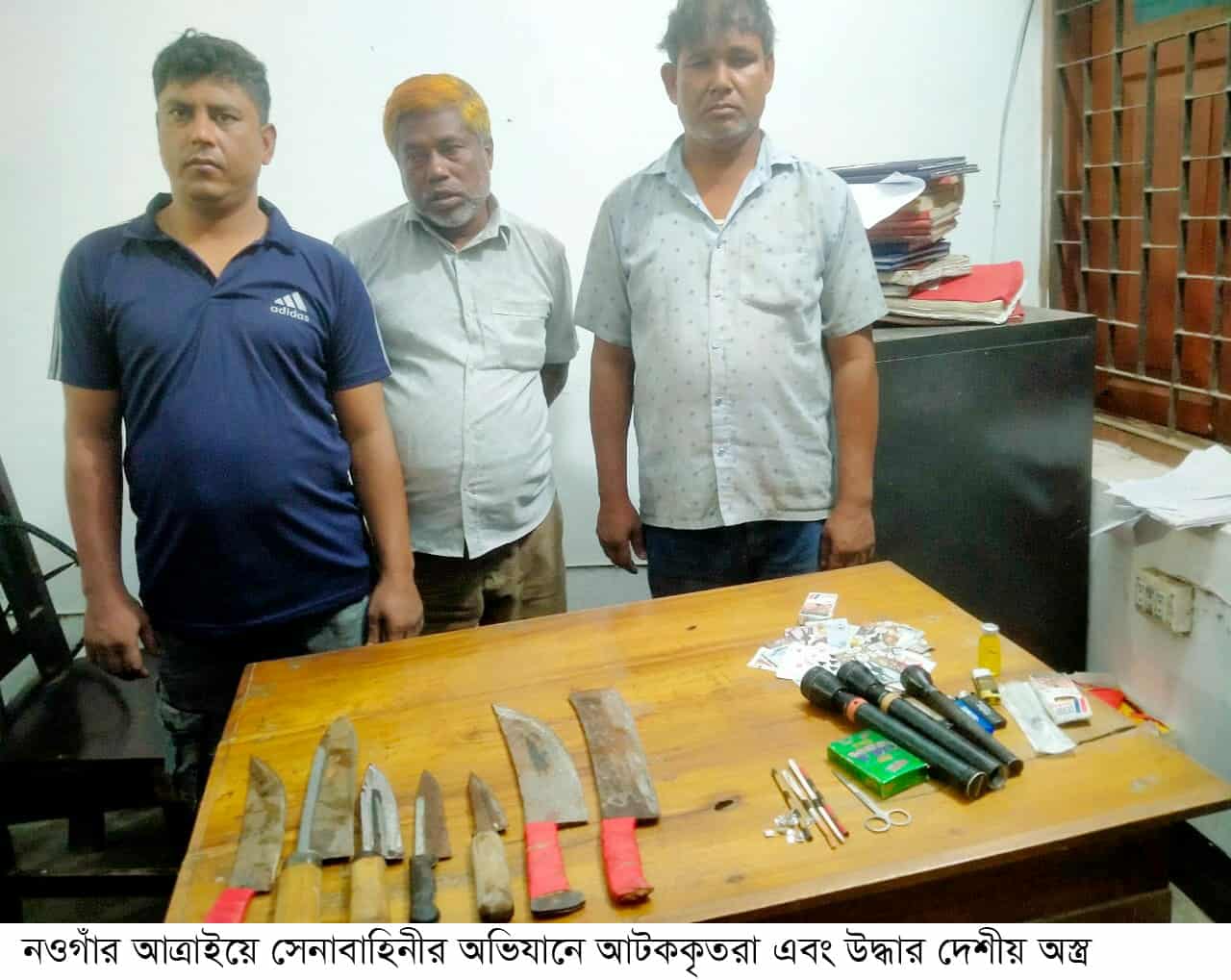 আত্রাই (নওগাঁ) প্রতিনিধি : নওগাঁর আত্রাইয়ে থানাপুলিশ এবং সেনাবাহিনী পৃথক অভিযান চালিয়ে আওয়ামীলী,বিএনপি ও যুবদলনেতাসহ চারজনকে গ্রেফতার করেছে। এসময় বেশ কিছু দেশীয় অস্ত্র উদ্ধার করেছে সেনাবাহিনী। এঘটনায় রোববার রাতেই আত্রাই থানায় মামলা দায়ের করা হয়েছে। গ্রেফতারকৃতদের সোমবার আদালতে প্রেরণ করা হয়েছে। আত্রাই থানার ইন্সপেক্টর (তদন্ত) কাওছার আলম বলেন,রোববার থানাপুলিশ অভিযান চালিয়ে আত্রাই থানা আওয়ামীলীগের ত্রান ও সমাজ কল্যান বিষয়ক সম্পাদক ঘোষপাড়া গ্রামের আব্দুস ছামাদের ছেলে আব্দুল হামিদ (৫২) কে গ্রেফতার করা হয়েছে। গ্রেফতার আব্দুল হামিদ আত্রাই থানায় দায়েরকৃত বিস্ফোরক মামলার তদন্ত প্রাপ্ত আসামী। এছাড়া সেনাবাহিনীর একটি টহলদল রোববার রাতে উপজেলার ভবানীপুর গ্রামে অভিযান পরিচালনা করে। অভিযানে ওই গ্রামের ইছব আলীর ছেলে ফারুক হোসেন (৩৮),একই গ্রামের খয়ের আলীর ছেলে আবুল কালাম সরদার (৪০) এবং মিরাপুর গ্রামের সমসের আলীর ছেলে এরশাদ আলী (৫২) কে আটক করে। আটককালে তাদের নিকট থেকে চাপাতি,চাকুসহ ৮টি দেশীয় অস্ত্র উদ্ধার করে সেনাবাহিনী। এঘটনায় রাতেই আটককৃতদের আত্রাই থানায় সোর্পদ করে মামলা দায়ের করা হয়। ইন্সপেক্টর (তদন্ত) আরো জানান,আটককৃতরা এলাকায় দস্যুতার প্রস্তুতিকালে তাদেরকে আটক করা হয়েছে। এদিকে আটককৃতদের মধ্যে আবুল কালাম সরদার সাহাগোলা ইউনিয়ন বিএনপির সাংগঠনিক সম্পাদক এবং এরশাদ আলী সাহাগোলা ইউনিয়ন যুবদলের সভাপতি বলে নিশ্চিত করেছেন সাহাগোলা ইউনিয়ন বিএনপির সভাপতি রফিকুল ইসলাম রফিক। পুলিশের কর্মকর্তা কাওছার আলম আরো বলেন,দায়েরকৃত মামলায় গ্রেফতার দেখিয়ে সোমবার আদালতে প্রেরণ করা হয়েছে।