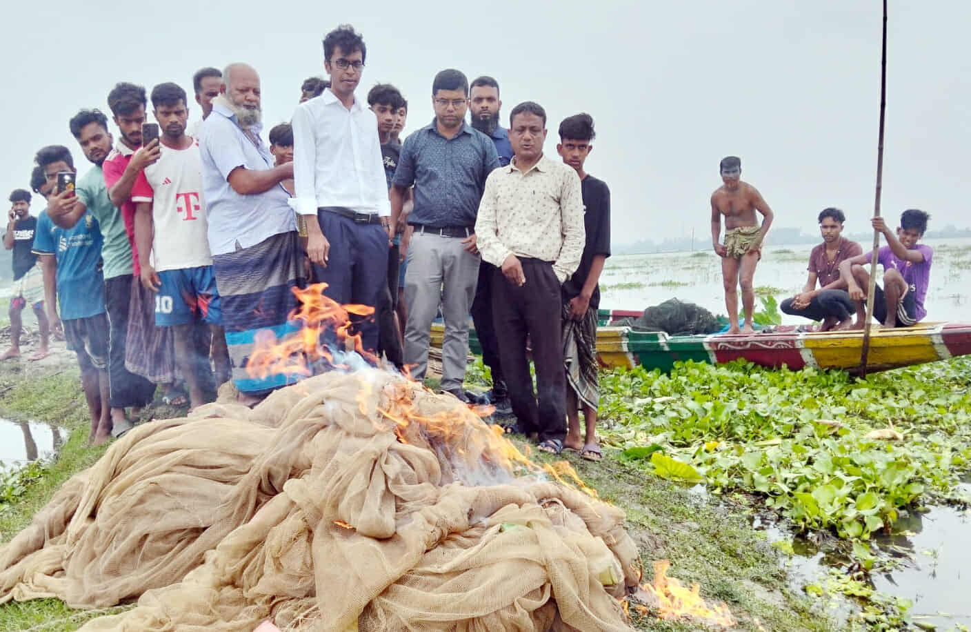 রাণীনগর (নওগাঁ) প্রতিনিধি: নওগাঁর রাণীনগরে ভ্রাম্যমাণ আদালতের অভিযান চালিয়ে লক্ষাধিক টাকার নিষিদ্ধ চায়না দুয়ারি রিং জাল ও ভাদাই জাল জব্দ করে আগুনে ভস্মিভূত করা হয়েছে। সোমবার বিকেলে উপজেলার মিরাট ইউনিয়নের কয়েকটি স্থানে এই অভিযান পরিচালনা করা হয়। রাণীনগর উপজেলা সিনিয়র মৎস্য কর্মকর্তা পলাশ চন্দ্র জানান, নিষিদ্ধ চায়না দুয়ারি রিং জাল এবং ভাদাই জাল দিয়ে উপজেলার মিরাট ইউনিয়নের বিল মুনসুর ও বিল চৌর এবং মিরাট ২নং স্লুইচ গেট এলাকায় মাছ নিধন চলছিল। এমন গোপন সংবাদের ভিত্তিতে এবং উপজেলা মৎস্য দপ্তরের আয়োজনে সোমবার বিকেলে উপজেলা সহকারী কমিশনার (ভূমি) শেখ নওশাদ হাসান এবং থানা পুলিশসহ অভিযান পরিচালনা করা হয়। অভিযানে বিল থেকে ৫০ হাজার টাকা মূল্যের ১৫০ মিটার নিষিদ্ধ চায়না দুয়ারি রিং জাল এবং আরো অর্ধ লক্ষাধীক টাকার ভাদাই জাল জব্দ করা হয়। পরে জালগুলো বিলের পারেই আগুন দিয়ে ভস্মিভূত করা হয়েছে।