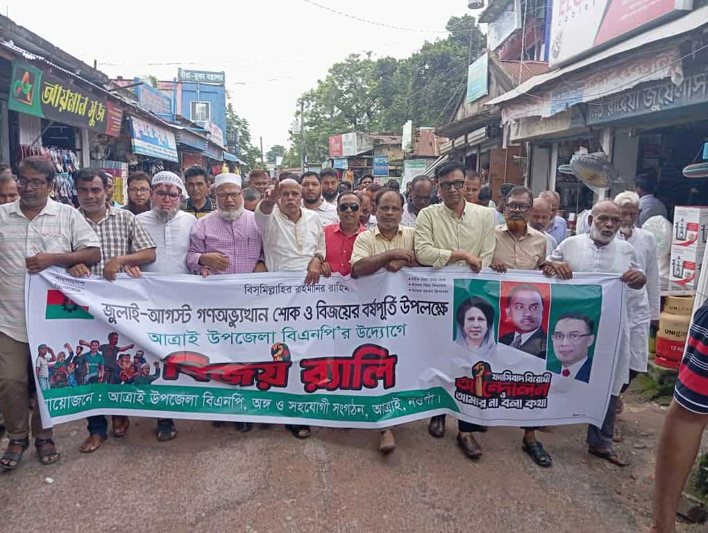 আত্রাই উপজেলা (নওগাঁ) প্রতিনিধিঃ জুলাই-আগষ্ট গনঅভ্যুত্থান শোক ও বিজয়ের বর্ষপূর্তি উদযাপন উপলক্ষে নওগাঁর আত্রাইয়ে বিএনপির বিজয় র্যালি ও সংক্ষিপ্ত পথসভা অনুষ্ঠিত হয়েছে। মঙ্গলবার (৫ আগষ্ট)বেলা সাড়ে ১১টায় উপজেলা বিএনপির উদ্যোগে বিএনপি দলীয় কার্যালয় থেকে জুলাই-আগষ্ট গনঅভ্যুত্থান শোক ও বিজয়ের বর্ষপূর্তি বিজয় র্যালিটি শহরে প্রধান সড়ক প্রদক্ষিণ শেষে উপজেলা পরিষদ গেটে উপজেলা বিএনপির সিনিয়র সহসভাপতি আলহাজ্ব মো.আব্দুল জলিল চকলেটের সভাপতিত্বে এক সংক্ষিপ্ত পথ সভা অনুষ্ঠিত হয়। বিএনপির বিজয় র্যালি ও সংক্ষিপ্ত পথ সভা অনুষ্ঠানে প্রধান অতিথি হিসেবে উপস্থিত ছিলেন উপজেলা বিএনপির সাধারণ সম্পাদক তসলিম উদ্দিন। উক্ত পথ সভায় আরো উপস্থিত ছিলেন -নওগাঁ জেলা যুব দলের সিনিয়র যুগ্ম আহ্বায়ক কে এম রওশন, উপজেলা বিএনপি যুগ্ম সাধারণ সম্পাদক, আব্দুল মান্নান সরদার,সাংগঠনিক সম্পাদক, আবুবকর সিদ্দিক, কামরুল হাসান সাগর,যুবদলের সিনিয়র যুগ্ম আহ্বায়ক খোরশেদ আলম, যুগ্ম আহ্বায়ক পারভেজ ইকবাল,আশরাফুল ইসলাম লিটন, স্বেচ্ছাসেবক দলের আহ্বায়ক আবুল কালাম আজাদ। সহ বিএনপি,সহযোগী ও অঙ্গ সংগঠন নেতা কর্মী উপজেলা ও ইউনিয়ন বিএনপির সকল নেতৃবৃন্দ উপস্থিত ছিলেন।