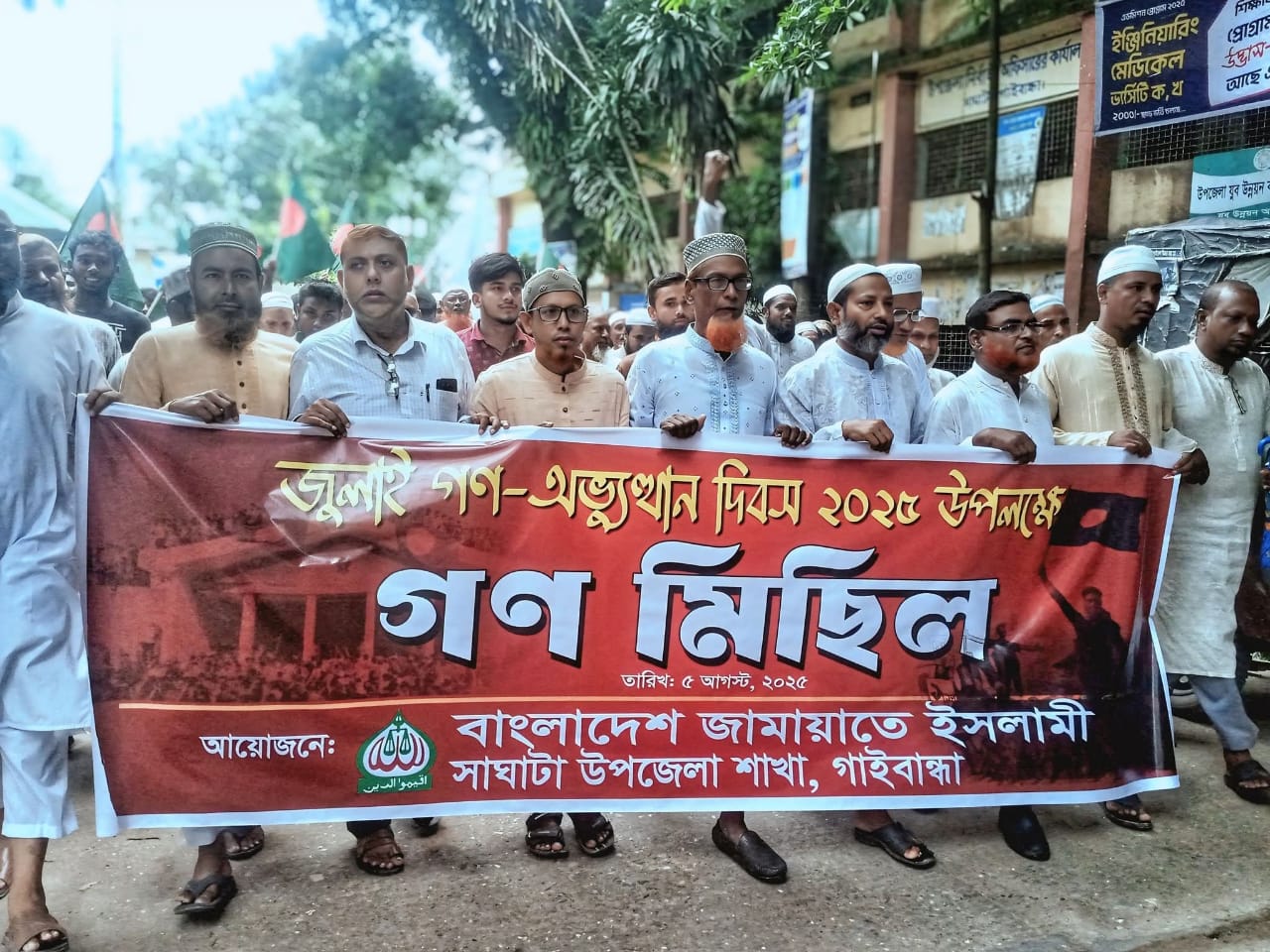 গাইবান্ধা জেলা প্রতিনিধিঃ বাংলাদেশ জামায়াতে ইসলামীর কেন্দ্রীয় ঘোষিত কর্মসূচী “জুলাই গণঅভ্যুত্থান দিবস-২০২৫” উপলক্ষে ০৫/০৮/২০২৫ইং, রোজঃ মঙ্গলবার, দুপুর ২ ঘটিকায়, সাঘাটা উপজেলা পরিষদ(বোনারপাড়া) চত্বর থেকে, গাইবান্ধা জেলা নায়েবে আমীর বীর মুক্তিযোদ্ধা আব্দুল ওয়ারেছ এর নেতৃত্বে বিশাল একটা মিছিল বের করা হয়। উক্ত মিছিল উপজেলা শহরের শহীদ মিনার, হাকিমের মোড়, রেল গেট, মুরগী হাটি, কাঁচাবাজার, মার্কেট এলাকা, ও পুরাতন ফাঁড়ি থানার সামনে দিয়ে বোনারপাড়া চৌরাস্তা হয়ে আবার উপজেলা পরিষদ চত্বরে গিয়ে শেষ করা হয়। এবং পূর্ব প্রস্তুতি অনুযায়ী উপজেলা চত্বরে সংক্ষিপ্ত সমাবেশের আয়োজন করা হয়। উক্ত সমাবেশে উপজেলা আমীর মাওঃ মোঃ ইব্রাহিম হোসনের সভাপতিত্বে এবং সেক্রেটারি মোঃ আব্দুল গফুরের সঞ্চালনায়, প্রধান অতিথি হিসেবে বক্তব্য রাখেন গাইবান্ধা-৫ আসনের জামায়াতে ইসলামী মনোনীত এমপি প্রার্থী ও জেলা জামায়াতের সিনিয়র নায়েবে আমীর বীর মুক্তিযোদ্ধা আব্দুল ওয়ারেছ, অন্যন্যদের মধ্যে আরও বক্তব্য রাখেন, জামায়াতের নায়েবে আমীর মাওঃ আব্দুল হামিদ, সাংগঠনিক সেক্রেটারি প্রভাষক মোঃ এনামুল হক সরকার, উপজেলা শ্রমিক কল্যাণ ফেডারেশনের সভাপতি মোঃ আব্দুল মান্নান, প্রশিক্ষণ সম্পাদক মাওঃ মোঃ জাহিদুল ইসলাম, উপজেলা , উপজেলা শিবির সভাপতি হাফেজ সাজেদুর রহমান,এছাড়াও উপস্থিত ছিলেন জেলা সাংস্কৃতিক বিভাগের সেক্রেটারি মাওলানা মোঃ শাফিউল ইসলাম, উপজেলা কর্মপরিষদ সদস্য মাওঃ ওয়াহিদুজ্জামান ফারুকী, গোলাম রাব্বী ফারুক সহ ইউনিয়ন সভাপতি, সেক্রেটারি এবং বিভিন্ন পর্যায়ের দায়িত্বশীল ও কর্মী সমর্থক বৃন্দ।প্রধান অতিথি তার বক্তব্যে বলেন,