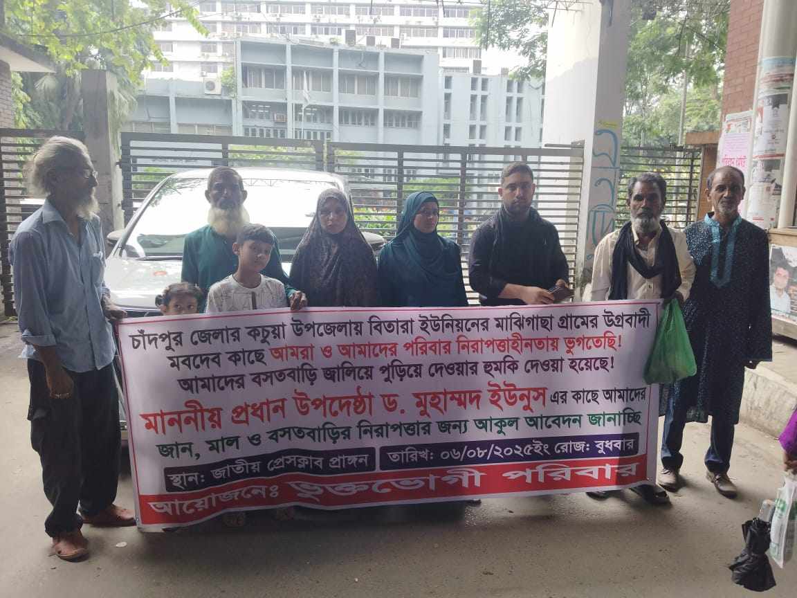 শোয়েব হোসেন : চাঁদপুর জেলার কচুয়া উপজেলার বিতারা ইউনিয়নের মাঝিগাছা গ্রামে আধ্যাত্মিকধর্মী ভিন্নমত ও ইসলামী তরিকত চর্চার কারণে মাসুদ মোল্লা ও আবুল বাশার নামের দুই ব্যক্তি এবং তাদের পরিবার চরম নিরাপত্তাহীনতায় ভুগছেন। অভিযোগ রয়েছে, মৌলবাদে বিশ্বাসী একটি চরমপন্থী গোষ্ঠী তাদের হত্যার হুমকি দিয়েছে এবং বসতবাড়িতে আগুন ধরিয়ে দেওয়ার হুঁশিয়ারি দিয়েছে। স্থানীয় সূত্র মতে, মাসুদ মোল্লা ও আবুল বাশার দীর্ঘদিন ধরে একটি আধ্যাত্মিক ও ভিন্নধর্মী তরিকত অনুসরণ করে আসছেন। তবে গ্রামবাসীর একাংশ তাদের এই ধর্মচর্চাকে “ভ্রান্ত মতবাদ” বলে আখ্যা দিয়ে তা বন্ধ করতে চাপ সৃষ্টি করছে। এ নিয়ে হুমকি-ধামকি ক্রমাগত বেড়েই চলেছে। মাসুদ মোল্লা বলেন, “আমরা আল্লাহর প্রেমে ইবাদত করি, কারো কোনো ক্ষতি করিনি। অথচ আমাদের ধর্মচর্চার কারণে এখন প্রাণনাশের হুমকি আসছে। এই ভেবে আমাদের পরিবার রাতের আঁধারে প্রাণ হাতে করে ঢাকায় পালিয়ে এসেছে।” আবুল বাশার জানান, “আমার স্ত্রী ও ছোট ছেলেকে রেখে গ্রাম ছাড়তে বাধ্য হয়েছি। পরিবার নিয়ে খুব শীঘ্রই ঘরছাড়া হওয়ার পরিকল্পনা করছি, কারণ রাতে ঘুমাতেও ভরসা পাই না।” আজ (৬ আগস্ট) ঢাকায় জাতীয় প্রেসক্লাবের সামনে মানববন্ধন করে তাঁরা প্রধান উপদেষ্টা ডা. মুহাম্মদ ইউনূসের কাছে জান-মালের নিরাপত্তা এবং বসতবাড়ি রক্ষার দাবি জানান। এ বিষয়ে কচুয়া থানার অফিসার ইনচার্জ (ওসি) জানান, “এখনো লিখিত কোনো অভিযোগ পাইনি। অভিযোগ পেলে যথাযথ তদন্ত করে আইনানুগ ব্যবস্থা গ্রহণ করা হবে।” মানবাধিকার সংগঠনের প্রতিক্রিয়া মানবাধিকার সংগঠন হিউম্যান এইড অ্যান্ড ট্রাস্ট ইন্টারন্যাশনালের নির্বাহী পরিচালক মোহাম্মদ বিল্লাল হোসেন বলেন, “ঘটনাটি ধর্মীয় স্বাধীনতা ও মতপ্রকাশের অধিকারের বিরুদ্ধে স্পষ্ট হুমকি। আমরা প্রশাসনের দ্রুত হস্তক্ষেপ ও সুষ্ঠু তদন্ত দাবি করছি।” প্রশ্ন উঠছে— বাংলাদেশে কি এখনো কেউ ভিন্ন মত ও ধর্মীয় বিশ্বাস নিয়ে নিরাপদে বাঁচতে পারে? এটি শুধু একটি গ্রামের বিচ্ছিন্ন ঘটনা নয়; বরং ধর্মীয় সহনশীলতা, মানবাধিকার ও নাগরিক নিরাপত্তা নিয়ে এক গভীর প্রশ্ন।