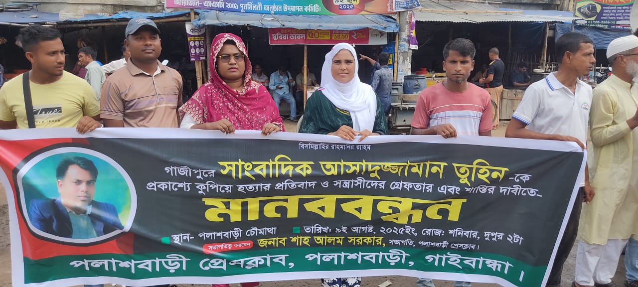 শিরিন আক্তার, গাইবান্ধাঃ গাইবান্ধার পলাশবাড়ী সাংবাদিক সমাজের আয়োজনে সাংবাদিক তুহিন হত্যার প্রতিবাদে মানববন্ধন অনুষ্ঠিত হয়েছে।৯ আগষ্ট শনিবার দুপুরে পলাশবাড়ী পৌর শহরের চারমাথা মোড়ে সাংবাদিক সমাজের আয়োজনে সাপ্তাহিক অনর পত্রিকার সম্পাদক পলাশবাড়ি প্রেসক্লাবের সভাপতি শাহ আলম সরকারের সভাপতিত্বে মানববন্ধনে বক্তব্য প্রদান করেন পলাশবাড়ী উপজেলা বিএনপির সাধারণ সম্পাদক আবু আলা মওদুদ,পলাশবাড়ী পৌর জামায়াতের সাবেক সেক্রেটারি তাজুল ইসলাম মিলন , পলাশবাড়ী মডেল প্রেস ক্লাবের সভাপতি রবিউল হোসেন পাতা,