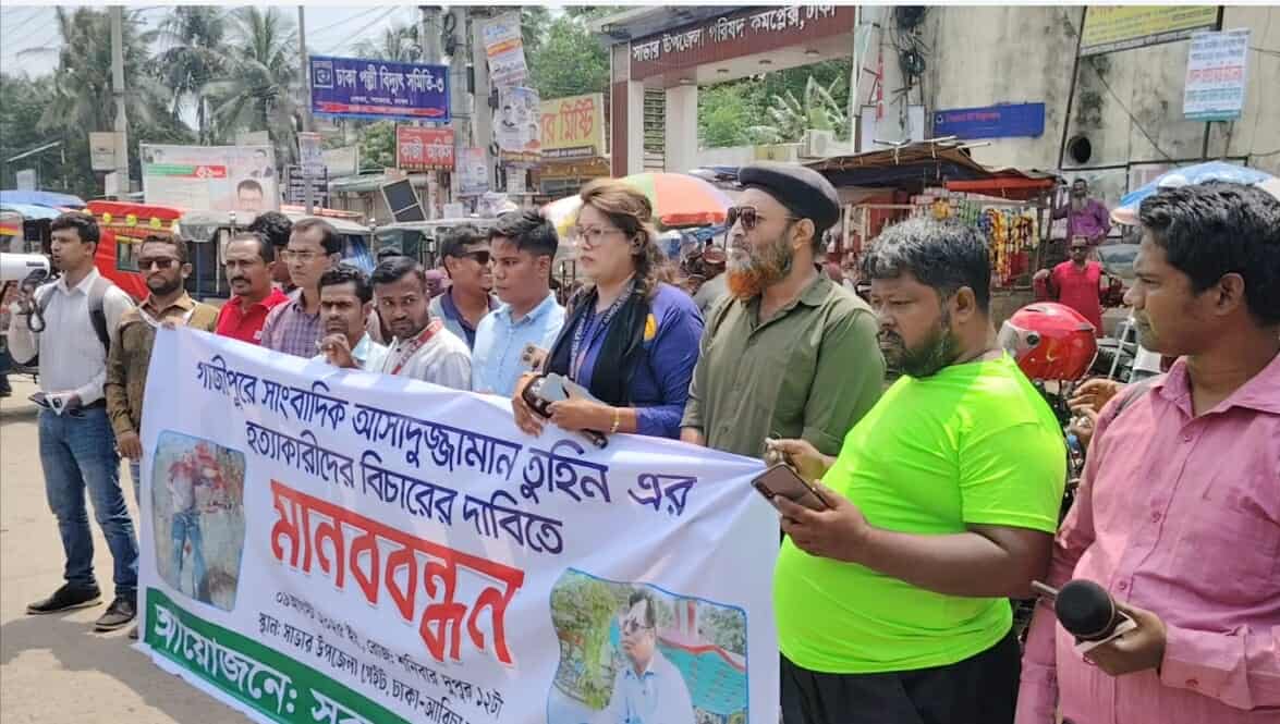 মোঃ রুবেল হোসেন (সাভার) ঢাকা : গাজীপুরের সাংবাদিক আসাদুজ্জামান তুহিনকে নৃশংসভাবে হত্যার প্রতিবাদে সাভার কর্মরত সাংবাদিক সমাজও রাজপথে নেমেছে। দেশব্যাপী চলমান প্রতিবাদের অংশ হিসেবে আজ, শনিবার, ৯ই আগস্ট বিকেলে সাভার উপজেলা পরিষদ চত্বরের সামনে এক মানববন্ধন ও প্রতিবাদ সমাবেশ অনুষ্ঠিত হয়। সাভারে কর্মরত বিভিন্ন প্রিন্ট, ইলেকট্রনিক ও অনলাইন মিডিয়ার সাংবাদিকরা এই কর্মসূচিতে অংশ নেন। তারা হাতে হাত ধরে মানববন্ধন তৈরি করে এই পাশবিক হত্যাকাণ্ডের তীব্র নিন্দা ও ক্ষোভ প্রকাশ করেন। সাংবাদিকদের হাতের প্ল্যাকার্ডে “আমার ভাই মরলো কেন, সরকার জবাব চাই”, “সাংবাদিক হত্যার বিচার চাই”, “খুনিদের ফাঁসি চাই” ইত্যাদি স্লোগান লেখা ছিল। সমাবেশে বক্তারা বলেন, তুহিনের হত্যাকাণ্ড কোনো বিচ্ছিন্ন ঘটনা নয়, এটি মুক্ত সাংবাদিকতার কণ্ঠরোধ করার একটি ঘৃণ্য প্রচেষ্টা। দুর্বৃত্তরা সত্য প্রকাশে বাধা দিতেই সাংবাদিকদের ওপর বারবার হামলা চালাচ্ছে। তারা অবিলম্বে সাংবাদিক আসাদুজ্জামান তুহিন হত্যার সাথে জড়িত মূল পরিকল্পনাকারীসহ সকল আসামিকে গ্রেপ্তার করে দ্রুত বিচার আইনের আওতায় এনে সর্বোচ্চ শাস্তি নিশ্চিত করার জন্য সরকারের কাছে জোর দাবি জানান। বক্তারা আরও বলেন, সারাদেশে সাংবাদিক নির্যাতন ও হত্যার ঘটনা বেড়েই চলেছে। সাগর-রুনি হত্যাকাণ্ডসহ কোনো সাংবাদিক হত্যার বিচার না হওয়ায় সন্ত্রাসীরা সুযোগ পেয়ে যাচ্ছে। এই অবস্থা চলতে থাকলে গণমাধ্যমের স্বাধীনতা এবং সাংবাদিকদের নিরাপত্তা মারাত্মকভাবে বিঘ্নিত হবে। অবিলম্বে একটি শক্তিশালী “সাংবাদিক সুরক্ষা আইন” প্রণয়নের দাবিও পুনর্ব্যক্ত করেন তারা।এই প্রতিবাদ কর্মসূচি থেকে হুঁশিয়ারি উচ্চারণ করে বলা হয়, যদি নির্দিষ্ট সময়ের মধ্যে তুহিন হত্যার সকল আসামি গ্রেপ্তার না হয় এবং বিচার প্রক্রিয়া শুরু না হয়, তবে সাভারের সাংবাদিকরা আরও কঠোর কর্মসূচি ঘোষণা করতে বাধ্য হবে।