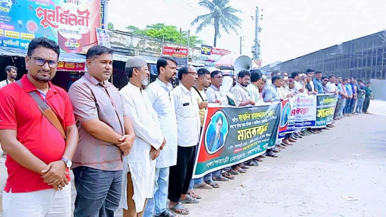মোঃ উজ্জ্বল সরকার ,গাইবান্ধা জেলা প্রতিনিধি: গাজীপুরে সাংবাদিক মোঃ আসাদুজ্জামান তুহিন হত্যাকাণ্ডের প্রতিবাদে গাইবান্ধার পলাশবাড়ীতে মানববন্ধন কর্মসূচি পালন করেছেন সাংবাদিকরা। শনিবার ৯ আগস্ট দুপুর ২টায় উপজেলা গেট সংলগ্ন চৌমাথা মোড়ে পলাশবাড়ী সাংবাদিক সমাজের ব্যানারে এই কর্মসূচি অনুষ্ঠিত হয়। প্রচণ্ড রোদের তাপদহ উপেক্ষা করে জেলার বিভিন্ন গণমাধ্যমের প্রতিনিধিরা মানববন্ধনে অংশ নেন। বক্তারা সাংবাদিক তুহিন হত্যায় জড়িতদের দ্রুত গ্রেপ্তার, সুষ্ঠু তদন্ত ও দৃষ্টান্তমূলক শাস্তির দাবি জানান। একইসঙ্গে, সাংবাদিকদের বিরুদ্ধে মিথ্যা মামলা, হয়রানি ও নির্যাতন বন্ধের আহ্বান জানান তারা। কর্মসূচিতে সভাপতিত্ব করেন পলাশবাড়ী প্রেসক্লাব সভাপতি ও সাপ্তাহিক অনড় পত্রিকার সম্পাদক মোঃ শাহ আলম সরকার, সঞ্চালনায় ছিলেন পলাশবাড়ী রিপোর্টার্স ইউনিটির সাধারণ সম্পাদক মোঃ সিরাজুল ইসলাম। মানববন্ধনে বক্তব্য রাখেন: পলাশবাড়ী মডেল প্রেসক্লাবের সভাপতি রবিউল হোসেন পাতা, পলাশবাড়ী প্রেসক্লাব সাধারণ সম্পাদক পাপুল সরকার,পলাশবাড়ী প্রেসক্লাবের সাবেক সভাপতি ফজলুল হক দুদু, পলাশবাড়ী প্রেসক্লাবের সাবেক সহ-সভাপতি দৈনিক সংগ্রাম পত্রিকার সংবাদ দাতা ফেরদাউস মিয়া,পলাশবাড়ী প্রেসক্লাবের সাবেক সহ-সভাপতি সাইদুর রহমান মাষ্টার,খবরবাড়ি টুয়েন্টি ফোর ডটকমের সম্পাদক মোঃ মশফিকুর রহমান মিলটন,পলাশবাড়ী প্রেসক্লাব সহ সাধারণ সম্পাদক হাসিবুর রহমান স্বপন,বাংলাদেশ প্রেসক্লাব পলাশবাড়ী উপজেলা শাখার সভাপতি আমিরুল ইসলাম কবির,পলাশবাড়ী রিপোর্টার্স ইউনিটির সাবেক সাধারণ সম্পাদক শহিদুল ইসলাম, বৈশাখী টেলিভিশনের গাইবান্ধা জেলা প্রতিনিধি এসএম বিপ্লব, রিপোর্টাস ইউনিটির সাংগঠনিক সম্পাদক ও সময়ের কন্ঠস্বরের জেলা প্রতিনিধ রবিউল ইসলাম, পলাশবাড়ী প্রেসক্লাবের সাংগঠনিক সম্পাদক আব্দুল মতিন,সিনিয়র সাংবাদিক দৈনিক করতোয়া পলাশবাড়ী উপজেলা প্রতিনিধি ছাদেকুল ইসলাম রুবেল, দৈনিক আমার সংবাদ এর পলাশবাড়ী প্রতিনিধি মিজানুর রহমান নিক্সন, দৈনিক সোনালী কন্ঠ পত্রিকার সাগর সরকার মিনুসহ স্থানীয় গণমাধ্যমকর্মীরা। এ মানববন্ধনে সাংবাদিকদের সাথে সংহতি জানিয়ে বক্তব্য রাখেন পলাশবাড়ী উপজেলা বিএনপির সাধারণ সম্পাদক আবু আলা মওদুদ,পলাশবাড়ী উপজেলা ছাত্র শিবিরের সাবেক সাধারণ সম্পাদক তাজুল ইসলাম মিলন সহ উপজেলায় কর্মরত অন্যান্য সংবাদকর্মী, সামাজিক, রাজনৈতিক ব্যক্তিবর্গ। সাংবাদিকরা বলেন, ‘দেশে একের পর এক সাংবাদিক হত্যাকাণ্ড ঘটলেও সঠিক বিচার না হওয়ায় অপরাধীরা বারবার সাহস পেয়ে যাচ্ছে। এ ধারাবাহিকতা রুখতে এখনই রাষ্ট্রকে কঠোর পদক্ষেপ নিতে হবে।