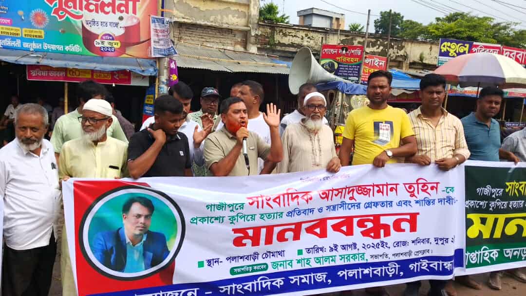 আশরাফুজ্জামান সরকার, গাইবান্ধাঃ– গাজীপুরের সাংবাদিক আসাদুজ্জামান তুহিন হত্যার প্রতিবাদে গাইবান্ধার পলাশবাড়ী সাংবাদিক সমাজের আয়োজনে এক মানববন্ধন অনুষ্ঠিত হয়েছে। ৯ আগষ্ট শনিবার দুপুরে পলাশবাড়ী পৌর শহরের চারমাথা মোড়ে সাংবাদিক সমাজের আয়োজনে সাপ্তাহিক অনড় পত্রিকার সম্পাদক পলাশবাড়ি প্রেসক্লাব সভাপতি শাহ আলম সরকারের সভাপতিত্বে এ মানববন্ধনে বক্তব্য রাখেন পলাশবাড়ী মডেল প্রেসক্লাব সভাপতি রবিউল হোসেন পাতা, দৈনিক করতোয়া প্রতিনিধি ও জৈষ্ঠ্য সাংবাদিক সাদেকুল ইসলাম রুবেল, খবরবাড়ি ডটকম সম্পাদক মুশফিকুর রহমান মিল্টন, পলাশবাড়ী প্রেসক্লাবের সাধারণ সম্পাদক পাপুল সরকার, প্রেসক্লাব যুগ্ম সাধারণ সম্পাদক হাসিবুর রহমান স্বপন, বাংলাদেশ প্রেসক্লাব পলাশবাড়ী উপজেলা শাখার সভাপতি আমিরুল ইসলাম কবির, সময়ের কন্ঠস্বর জেলা প্রতিনিধি রবিউল ইসলাম, পলাশবাড়ী প্রেসক্লাব সহ-সভাপতি আশরাফুজ্জামান সরকার, সাংগঠনিক সম্পাদক আব্দুল মতিন, দৈনিক আমার সংবাদ এর পলাশবাড়ী প্রতিনিধি মিজানুর রহমান নিক্সন, দৈনিক সংগ্রাম পত্রিকার সংবাদদাতা ফেরদাউস মিয়া, প্রতিদিনের সংবাদ এর সোহেল রানা, দৈনিক গণমুক্তি প্রতিনিধি শাহারুল ইসলাম, দৈনিক একুশের বাণী’র আশরাফুল আলম, দৈনিক সোনালী কন্ঠের সাগর সরকার মিনু সহ স্থানীয় গণমাধ্যমকর্মীরা। এ মানববন্ধনে সাংবাদিকদের সাথে সংহতি জানিয়ে বক্তব্য রাখেন পলাশবাড়ী উপজেলা বিএনপির সাধারণ সম্পাদক আবু আলা মওদুদ,পলাশবাড়ী পৌর জামায়াতে ইসলামীর সাবেক সেক্রেটারি তাজুল ইসলাম মিলন। বক্তারা, গাজীপুরে সাংবাদিক আসাদুজ্জামান তুহিনের সকল হত্যাকারীদের দ্রুত গ্রেফতার ও দৃষ্টান্তমূলক শাস্তির দাবি জানান। সেই সাথে সাংবাদিক নিরাপত্তা আইন বাস্তবায়নে সরকারের নিকট জোর দাবী জানান। সমগ্র অনুষ্ঠানটি সঞ্চালন করেন রিপোর্টাস ইউনিটি পলাশবাড়ী’র সাধারণ সম্পাদক সিরাজুল ইসলাম