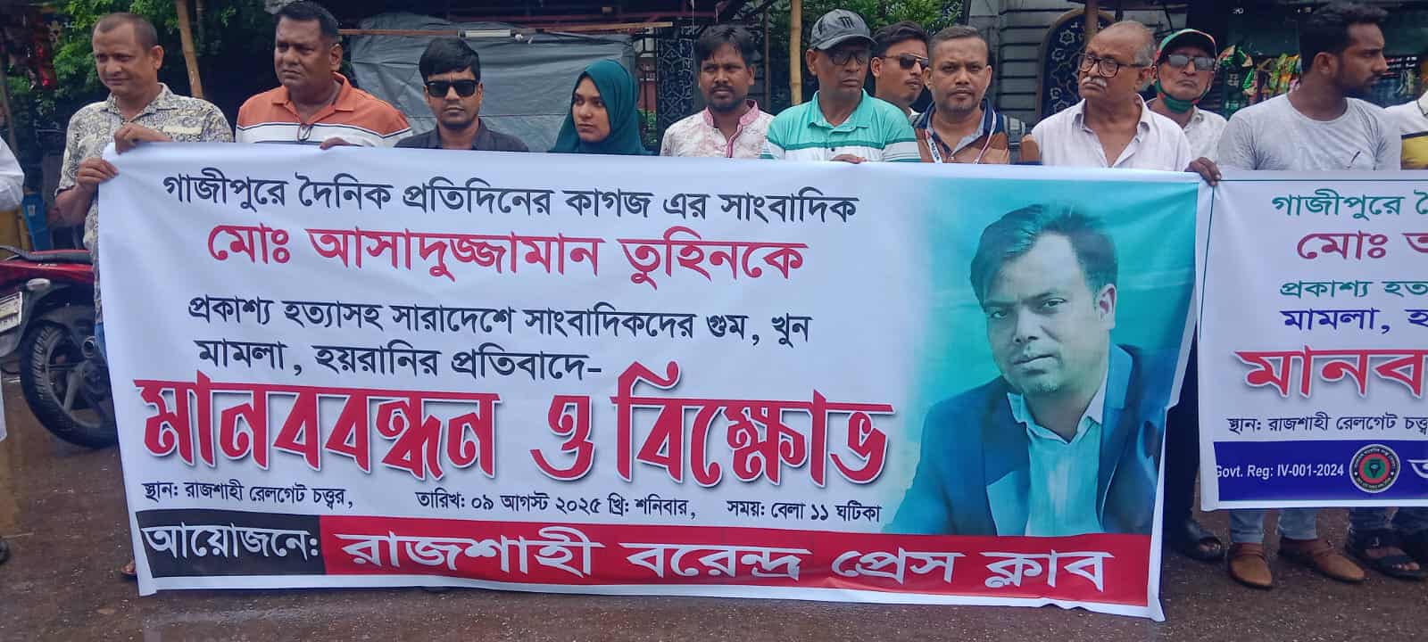 রাজশাহী প্রতিনিধি: গাজীপুরে ‘প্রতিদিনের কাগজ’ পত্রিকার সাংবাদিক মো. আসাদুজ্জামান তুহিন হত্যা ও বাংলাদেশের আলো পত্রিকার আনোয়ার হোসেনের উপর হামলা নির্যাতনের প্রতিবাদে রাজশাহীতে দুই স্থানে মানববন্ধন ও বিক্ষোভ মিছিল অনুষ্ঠিত হয়েছে। শনিবার বেলা ১১টায় নগরীর রেলগেট চত্ত্বরে রাজশাহী বরেন্দ্র প্রেসক্লাবের উদ্যোগে প্রথম মানববন্ধন কর্মসূচি হয়। এতে রাজশাহী বিভাগীয় প্রেসক্লাব, রাজশাহী অনলাইন সাংবাদিক ফোরাম, বাংলাদেশ সাংবাদিক সংস্থা ও জাতীয় সাংবাদিক সংস্থার ব্যানারে শতাধিক সাংবাদিক অংশ নেন। মানববন্ধন শেষে বিক্ষোভ মিছিল বের হয়। বিক্ষোভ মিছিলটি রেলগেট থেকে নিউমার্কেট হয়ে নগরীর জিরোপয়েন্টে গিয়ে শেষ হয়। দুপুর ১২ টায় রাজশাহী প্রেসক্লাবের উদ্যোগে সাহেব বাজার জিরো পয়েন্টে দ্বিতীয় মানববন্ধন অনুষ্ঠিত হয়। সেখানে রাজশাহী প্রেসক্লাবের সঙ্গে একাত্মতা ঘোষণা করেন রাজশাহী বরেন্দ্র প্রেসক্লাব, রাজশাহী বিভাগীয় প্রেসক্লাব, অনলাইন সাংবাদিক ফোরাম, বাংলাদেশ সাংবাদিক সংস্থা ও জাতীয় সাংবাদিক সংস্থা। এছাড়াও রাজশাহীর সিনিয়র সাংবাদিকরা উক্ত মানববন্ধনে অংশ নেয়। উভয় কর্মসূচিতেই গাজীপুরে সাংবাদিক তুহিন হত্যার দ্রুত বিচার এবং সাংবাদিকদের নিরাপত্তা নিশ্চিতের দাবি জানানো হয়। মানববন্ধনে বক্তারা বলেন, “তুহিন হত্যাকাণ্ড শুধুমাত্র একজন সাংবাদিকের মৃত্যু নয়, এটি দেশের গণমাধ্যমের ওপর ভয়ংকর আঘাত।” তারা আরও বলেন, “আমরা জীবনের ঝুঁকি নিয়ে সত্য প্রকাশ করি, অথচ আমাদের নিরাপত্তার কোনো নিশ্চয়তা নেই—এটি মেনে নেওয়া যায় না। সরকারকে অবিলম্বে সাংবাদিক সুরক্ষা আইন বাস্তবায়ন করতে হবে, যাতে আর কোনো তুহিনকে প্রাণ হারাতে না হয়।” সাংবাদিক নেতারা দাবি জানান, তুহিন হত্যাকারীদের দ্রুত গ্রেপ্তার করে দৃষ্টান্তমূলক শাস্তি দিতে হবে, যাতে ভবিষ্যতে কেউ সাংবাদিকদের ওপর হামলার সাহস না পায়। তারা আরও বলেন, “গণতন্ত্র টিকিয়ে রাখতে মুক্ত গণমাধ্যম অপরিহার্য। সাংবাদিকদের ওপর হামলা মানে জনগণের কণ্ঠরোধ করা। সাংবাদিকদের নিরাপত্তা নিশ্চিত না হওয়া পর্যন্ত আমরা রাজপথ ছাড়ব না।” এ সময় রাজশাহীর বিভিন্ন পত্রিকা, অনলাইন নিউজ পোর্টাল, টেলিভিশন ও পত্রিকার সাংবাদিকরা একত্রিত হয়ে তুহিন হত্যার তীব্র নিন্দা ও প্রতিবাদ জানান।