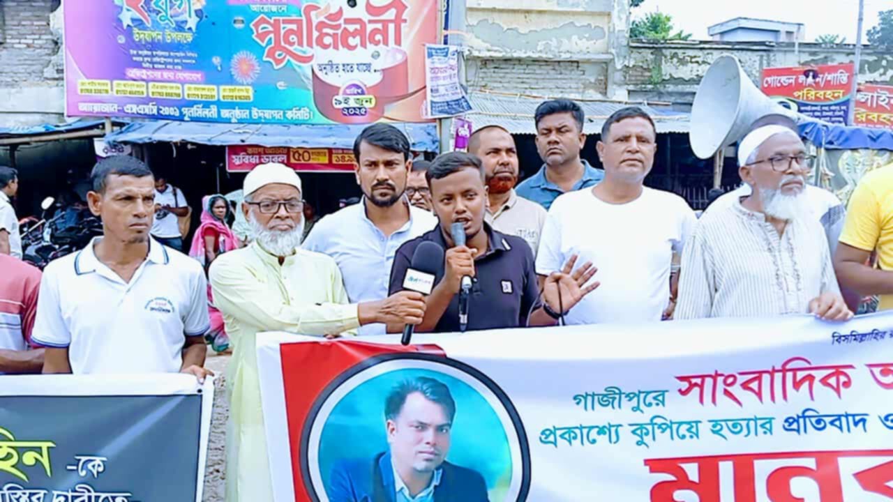 পাপুল সরকার,পলাশবাড়ী: গাজীপুরের সাংবাদিক আসাদুজ্জামান তুহিন হত্যার প্রতিবাদে গাইবান্ধার পলাশবাড়ী সাংবাদিক সমাজের আয়োজনে এক মানববন্ধন অনুষ্ঠিত হয়েছে। ৯ আগষ্ট শনিবার দুপুরে পলাশবাড়ী পৌর শহরের চারমাথা মোড়ে সাংবাদিক সমাজের আয়োজনে সাপ্তাহিক অনর পত্রিকার সম্পাদক পলাশবাড়ি প্রেসক্লাবের সভাপতি শাহ আলম সরকারের সভাপতিত্বে এ মানববন্ধনে বক্তব্য রাখেন পলাশবাড়ী মডেল প্রেস ক্লাবের সভাপতি রবিউল হোসেন পাতা, পলাশবাড়ী প্রেসক্লাবের সাধারণ সম্পাদক পাপুল সরকার,পলাশবাড়ী অনলাইন প্রেসক্লাবের প্রতিষ্ঠাতা আহবায়ক মুশফিকুর রহমান মিল্টন,বাংলাদেশ প্রেসক্লাব পলাশবাড়ী উপজেলা শাখার সভাপতি আমিরুল ইসলাম কবির, সময় টেলিভিশনের গাইবান্ধা জেলা প্রতিনিধি এসএম বিপ্লব, রিপোর্টাস ইউনিটির সাংগঠনিক সম্পাদক রবিউল ইসলাম, পলাশবাড়ী প্রেসক্লাবের সাংগঠনিক সম্পাদক আব্দুল মতিন, দৈনিক আমার সংবাদ এর পলাশবাড়ী প্রতিনিধি মিজানুর রহমান নিক্সন, দৈনিক করতোয়া পত্রিকা প্রতিনিধি সাদেকুল ইসলাম রুবেল, দৈনিক সংগ্রাম পত্রিকার সংবাদাতা ফেরদাউস মিয়া, সাংবাদিক হাসিবুর রহমান স্বপন, দৈনিক সোনালী কন্ঠ পত্রিকার সাগর সরকার মিনুসহ স্থানীয় গণমাধ্যমকর্মীরা। এ মানববন্ধনে সাংবাদিকদের সাথে সংহতি জানিয়ে বক্তব্য রাখেন পলাশবাড়ী উপজেলা বিএনপির সাধারণ সম্পাদক আবু আলা মওদুদ,পলাশবাড়ী উপজেলা ছাত্র শিবিরের সাবেক সাধারণ সম্পাদক তাজুল ইসলাম মিলন। এ সময় উপস্থিত ছিলেন ও মানববন্ধনে সংহতি জানিয়ে অংশ নেন উপজেলায় কর্মরত অন্যান্য সংবাদকর্মী, সামাজিক, রাজনৈতিক ব্যক্তিবর্গ। বক্তারা, গাজীপুরে সাংবাদিক আসাদুজ্জামান তুহিনের সকল হত্যাকারীদের দ্রুত গ্রেফতার ও দৃষ্টান্তমূলক শাস্তির দাবি জানান। সেই সঙ্গে সাংবাদিক নিরাপত্তা আইন বাস্তবায়নে সরকারের নিকট জোড় দাবী জানান।