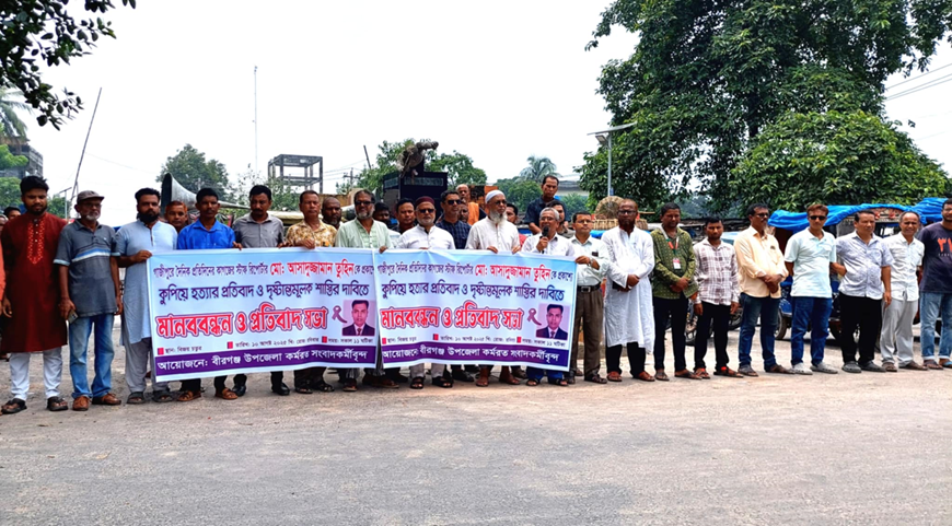 মোঃ ইউসুফ আলী, দিনাজপুর সংবাদ দাতা: গাজীপুরে দৈনিক প্রতিদিনের কাগজের স্টাফ রিপোর্টার আসাদুজ্জামান তুহিনকে প্রকাশ্যে কুপিয়ে হত্যার প্রতিবাদ ও দৃষ্টান্তমূলক শাস্তির দাবিতে বীরগঞ্জে মানববন্ধন ও প্রতিবাদ সভা অনুষ্ঠিত হয়েছে। রবিবার (১০ আগষ্ট) সকাল ১১ টায় বীরগঞ্জ উপজেলার শহীদ মিনার চত্বরে স্থানীয় সংবাদকর্মীদের আয়োজনে এ মানববন্ধন ও প্রতিবাদ সভা অনুষ্ঠিত হয়। এতে স্থানীয় সাংবাদিকদের পাশাপাশি মুক্তিযোদ্ধা, বিভিন্ন রাজনৈতিক ও সামাজিক সংগঠনের প্রতিনিধিরা অংশগ্রহণ করেন। বক্তারা বলেন, দেশের কোনো সরকারের আমলেই সাংবাদিকরা নিরাপদ নন। সাংবাদিকদের জন্য নিরাপদ কর্মপরিবেশ নিশ্চিত করতে এবং হত্যার মতো ঘটনায় দোষীদের দৃষ্টান্তমূলক শাস্তির দাবিতে কঠোর আন্দোলনের হুঁশিয়ারি দেন। একটি স্বাধীন ও দায়িত্বশীল গণমাধ্যম রাষ্ট্র পরিচালনায় গুরুত্বপূর্ণ ভূমিকা রাখে। তাই সাংবাদিকদের নিরাপত্তা নিশ্চিত করা শুধু তাদের ব্যক্তিগত সুরক্ষার বিষয় নয়, বরং এটি রাষ্ট্রের গণতন্ত্র ও আইনের শাসন রক্ষার সঙ্গে সরাসরি সম্পৃক্ত। সকল সাংবাদিকরা সরকারের প্রতি আহ্বান জানান, অবিলম্বে সাংবাদিকদের নিরাপত্তা নিশ্চিত করতে একটি সময়োপযোগী ও কার্যকর আইন প্রণয়ন এবং তা কঠোরভাবে বাস্তবায়নের ব্যবস্থা গ্রহণ করা হোক। এসময় মানববন্ধনে বক্তব্য রাখেন বাংলাদেশ মুক্তিযোদ্ধা সংসদ দিনাজপুর জেলা ইউনিট কমান্ড এর যুগ্ম আহ্বায়ক বীরমুক্তিযোদ্ধা মো. কবিরুল ইসলাম, বীরগঞ্জ উপজেলা বিএনপির সভাপতি মো. মনজুরুল ইসলাম, উত্তরের কণ্ঠ পত্রিকার সম্পাদক মাহাবুর রহমান আঙ্গুর, দৈনিক যায়যায়দিন পত্রিকার কাহারোল প্রতিনিধি সুকুরায় রায়, দৈনিক পত্রালাপ পত্রিকার বীরগঞ্জ প্রতিনিধি দশরথ রায় বাবুল, দৈনিক যুগান্তর পত্রিকার বীরগঞ্জ প্রতিনিধি আব্দুর রাজ্জাক, দৈনিক কালের কণ্ঠ পত্রিকার বীরগঞ্জ প্রতিনিধি সোহেল আহমেদ, দৈনিক আজকের বসুন্ধরা পত্রিকার জেলা প্রতিনিধি ও বীরগঞ্জ সাংবাদিক সংস্থার সাধারণ সম্পাদক মোঃ ইউসুফ আলী, দৈনিক খোলা কাগজ পত্রিকার বীরগঞ্জ প্রতিনিধি হাসান জুয়েল, দৈনিক মানবজমিন পত্রিকার বীরগঞ্জ প্রতিনিধি নুরেআলম সিদ্দিকী, দৈনিক চাঁদনী বাজার ও মডেল প্রেসক্লাব এর সাধারণ সম্পাদক আব্দুল জলিল, দৈনিক বাংলাদেশ সমাচার পত্রিকার বীরগঞ্জ প্রতিনিধি জাহিদ হাসান সহ আরো অনেকে।