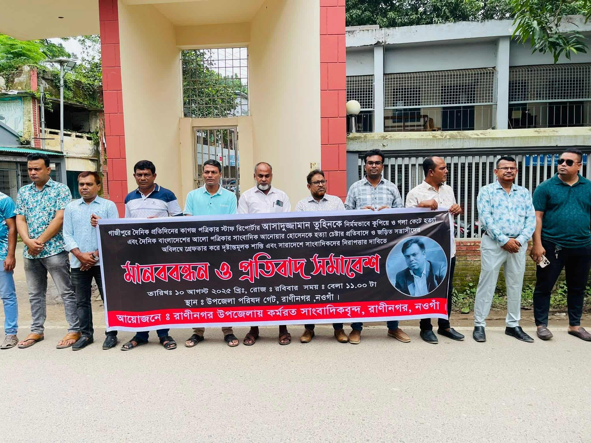 রাণীনগর (নওগাঁ) প্রতিনিধি: গাজীপুরে সাংবাদিক আসাদুজ্জামান তুহিনকে নির্মমভাবে কুপিয়ে ও গলা কেটে হত্যা ও সাংবাদিক আনোয়ার হোসেনকে হত্যা চেষ্টার প্রতিবাদে নওগাঁর রাণীনগরে মানববন্ধন ও প্রতিবাদ সমাবেশ করেছে সাংবাদিকরা। রোববার বেলা ১১টার দিকে রাণীনগর উপজেলায় কর্মরত সাংবাদিকবৃন্দদের ব্যানারে উপজেলা পরিষদের গেটের সামনে ঘন্টাব্যাপী এই মানববন্ধন ও প্রতিবাদ সমাবেশ অনুষ্ঠিত হয়। সিনিয়র সাংবাদিক হারুনুর রশিদের সভাপতিত্বে ও রহিদুল ইসলাম রাইপের সঞ্চালনায় সমাবেশে বক্তব্য রাখেন, সাংবাদিক সাইফুল ইসলাম, ওহেদুল ইসলাম মিলন, সাহাজুল ইসলাম, সুকুমল কুমার প্রামানিক, আব্দুর রউফ রিপন, মামুনুর রশিদ, আওরঙ্গজেব হোসেন রাব্বী, কাজী রহমান প্রমুখ। এ সময় বক্তারা- গাজীপুরে দৈনিক প্রতিদিনের কাগজ পত্রিকার স্টাফ রিপোর্টার আসাদুজ্জামান তুহিনকে নির্মমভাবে কুপিয়ে ও গলা কেটে হত্যা ও দৈনিক বাংলাদেশের আলো পত্রিকার সাংবাদিক আনোয়ার হোসেনকে হত্যা চেষ্টার তীব্র নিন্দা ও প্রতিবাদ জানায়। এছাড়া জড়িত সকল সন্ত্রাসীদের অবিলম্বে গ্রেফতার করে দৃষ্টান্তমূলক শাস্তি এবং সারাদেশে সাংবাদিকদের নিরাপত্তার দাবি জানান। মানববন্ধন ও প্রতিবাদ সমাবেশে রাণীনগর উপজেলায় বিভিন্ন প্রিন্ট ও ইলেকট্রনিক মিডিয়ায় কর্মরত সকল সাংবাদিকরা উপস্থিত ছিলেন।