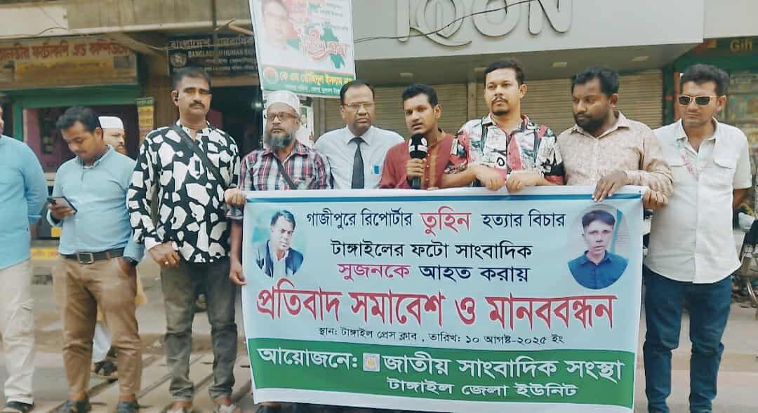 স্টাফ রিপোর্টার : জাতীয় সাংবাদিক সংস্থা টাঙ্গাইল জেলা ইউনিটের উদ্যোগ গাজীপুরের সাংবাদিক তুহিন হত্যার বিচার ও টাঙ্গাইলের ফটো সাংবাদিক সুজনকে পিটিয়ে আহত করায় প্রতিবাদ সমাবেশ ও মানববন্ধন অনুষ্ঠিত হয়েছে। ১০ ই আগস্ট রবিবার টাঙ্গাইল প্রেসক্লাবের সামনে পালন করা হয়। জাতীয় সাংবাদিক সংস্থা টাঙ্গাইল জেলা ইউনিটের আহ্বায়ক মাছুদুর রহমান মিলনের সভাপতিত্বে আলোচনায় অংশ নেন টাঙ্গাইল এডভোকেট সমিতির সহ-সভাপতি অ্যাডভোকেট মোবারক হোসেন, টাঙ্গাইল প্রেসক্লাবের সাহিত্য ও সংস্কৃতিক সম্পাদক হেমায়েত হোসেন হিমু, জাতীয় সাংবাদিক সংস্থা টাংগাইল জেলা ইউনিটের যুগ্ন আহবায়ক আবুল কালাম সিদ্দিকী নিপু, সদস্য সচিব সৈয়দ নাজমুল হোসেন, যুগ্ন সদস্য সচিব তরিকুল ইসলাম সান সিদ্দিকী, কাওসার আহমেদ, খালি হাতে উপজেলা ইউনিটির সভাপতি সৈয়দ মহসিন হাবিব সবুজ, সাধারণ সম্পাদক বিপ্লব সরকার প্রমুখ। এ সময় উপস্থিত ছিলেন জেলা ইউনিটের সদস্য হিমু,কামাল হোসেন,শুভ সাহা, মনির হোসেন, সুজন মিয়া প্রমুখ।