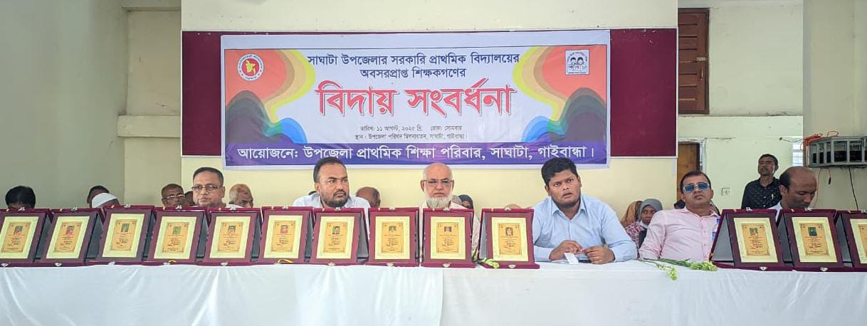 মোঃ মেহেদী হাসান ,স্টাফ রিপোর্টারঃ গাইবান্ধার সাঘাটা উপজেলা প্রাথমিক শিক্ষা পরিবার এর আয়োজনে ১১ আগস্ট (সোমবার) উপজেলা পরিষদ মিলনায়তনে উপজেলা প্রাথমিক শিক্ষা অফিসার আব্দুল্লাহ হিস শাফির সভাপতিত্বে সাঘাটা উপজেলা সরকারি প্রাথমিক বিদ্যালয়ের অবসরপ্রাপ্ত শিক্ষকগণের বিদায় সংবর্ধনা অনুস্ঠিত হয়েছে। উক্ত আলোচনা সভায় প্রধান অতিথির বক্তব্য রাখেন উপজেলা নির্বাহি অফিসার মীর মোহাম্মদ আল কামাহ তমাল। অন্যান্যদের মধে্যে বক্তব্য রাখেন রির্সোস সেন্টার অফিসার আব্দুল মান্নান, সহকারী শিক্ষা অফিসার মামুন অর রশিদ, আব্দুল লতিফ, শিক্ষক তৌহিদুল ইসলাম, বিদায়ী সাবেক প্রধান শিক্ষক আব্দুল মান্নান।শেষে সাবেক প্রধান শিক্ষকগণকে সম্মাননা প্রদান করা হয়।