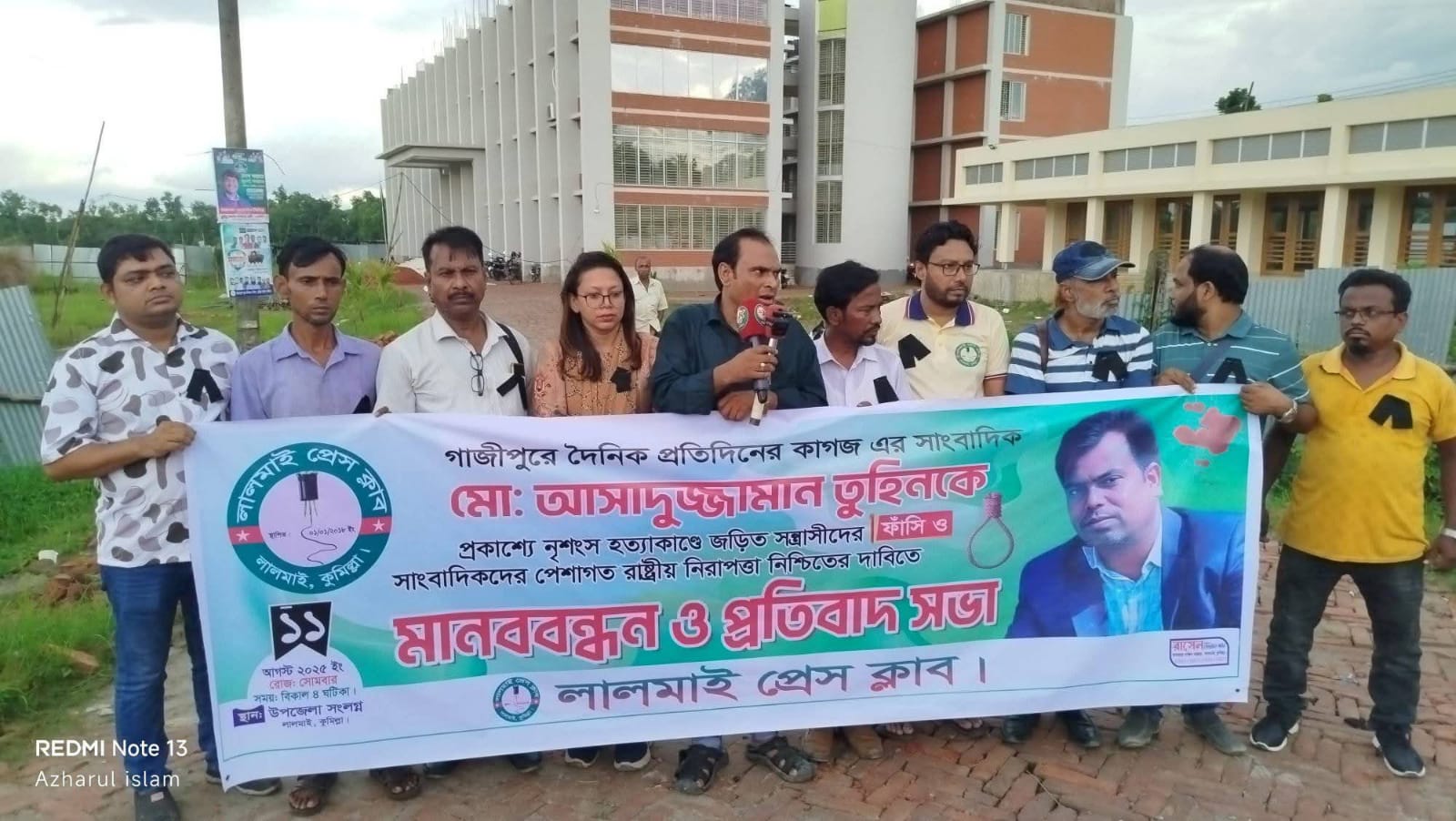 শাহাদাত কামাল শাকিল,কুমিল্লা : গাজীপুরে দৈনিক প্রতিদিনের কাগজ এর সাংবাদিক মো: আসাদুজ্জামান তুহিনকে প্রকাশ্যে নৃশংস হত্যাকাণ্ডে জড়িত সন্ত্রাসীদের ফাঁসি ও সাংবাদিকদের পেশাগত রাষ্ট্রীয় নিরাপত্তা নিশ্চিতের দাবিতে লালমাই প্রেসক্লাবের আয়োজনে মানববন্ধন ও প্রতিবাদ সভা অনুষ্ঠিত হয়েছে।