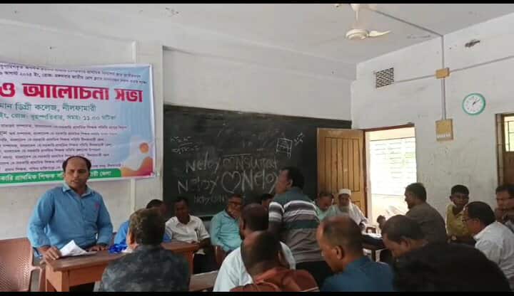 নীলফামারীতে প্রাথমিক ও গণশিক্ষা মন্ত্রণালয়ের কনসালটেশন কমিটি কতৃক সুপারিশকৃত অনধিক ৫ হাজার বেসরকারি প্রাথমিক বিদ্যালয় দ্রুত জাতীয়করণ বাস্তবায়নের লক্ষ্যে প্রধান উপদেষ্টার হস্তক্ষেপ কামনায় আগামী ১৯ আগষ্ট ২০২৫ ইং রোজ মঙ্গলবার জাতীয় প্রেসক্লাবে মানববন্ধন সফল করার লক্ষ্যে এক মতবিনিময় ও আলোচনা সভা নীলফামারী মশিয়ার রহমান ডিগ্রি কলেজ মাঠ প্রাঙ্গণে অনুষ্ঠিত হয়েছে।