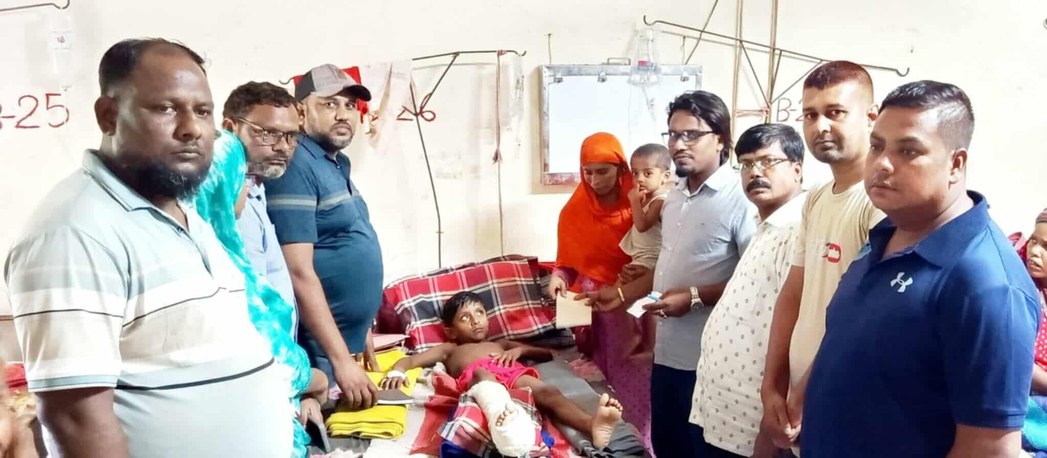 নিজস্ব প্রতিবেদকঃ- বগুড়া ২৫০ শয্যা বিশিষ্ট মোহাম্মদ আলী হাসপাতালের মহিলা অর্থো সার্জারি বিভাগের ২৬ নম্বর বেডে চিকিৎসাধীন রয়েছেন শাজাহানপুর উপজেলার মাঝিরা ইউনিয়নের সুজাবাদ গ্রামের মিঠু প্রাংয়ের কন্যা মোসাম্মৎ ফাহীন খাতুন। পারিবারিক আর্থিক অসচ্ছলতার কারণে শিশুটির চিকিৎসা ব্যয় বহন করা পরিবারটির পক্ষে কঠিন হয়ে পড়েছে। এমন পরিস্থিতিতে মানবতার হাত বাড়িয়ে দেন বাংলাদেশ জাতীয় মানবাধিকার অ্যাসোসিয়েশন, বগুড়া জেলা কমিটির নেতৃবৃন্দ। গত রোববার (১৭ আগস্ট) সংগঠনের একটি প্রতিনিধি দল হাসপাতালে গিয়ে অসুস্থ শিশুটির চিকিৎসার খোঁজখবর নেন এবং চিকিৎসাসেবা নিশ্চিতকরণে উদ্যোগী হন। এ সময় হাসপাতালের উপ-পরিচালক ডা. মো. মজিদুল ইসলাম ও আরএমও ডা. মো. রাশেদুল ইসলাম রনির সঙ্গে আলোচনায় বসে শিশুটির উন্নত চিকিৎসা নিশ্চিত করার অনুরোধ জানানো হয়। সংশ্লিষ্ট কর্তৃপক্ষ শিশুটির চিকিৎসায় সর্বোচ্চ সহযোগিতার আশ্বাস দেন। পরে সংগঠনের পক্ষ থেকে শিশুটির মায়ের হাতে চিকিৎসা বাবদ আর্থিক সহায়তাও প্রদান করা হয়। প্রতিনিধি দলে উপস্থিত ছিলেন—জেলা কমিটির সভাপতি চিকিৎসা প্রযুক্তিবিদ মো. আরমান হোসেন ডলার, সাধারণ সম্পাদক মো. জাহিদুল ইসলাম জাহিদ, যুগ্ম সাধারণ সম্পাদক মো. আহসান হাবীব আতিক, সাংগঠনিক সম্পাদক মো. সাব্বির হোসেন ছাবদুল, দপ্তর সম্পাদক মো. দেলোয়ার হোসেন, সহ-শ্রমবিষয়ক সম্পাদক মো. আল আমিন হোসেন, সমাজসেবা বিষয়ক সম্পাদক মোছা. নার্গিস খাতুন নাজমা, কার্যনির্বাহী সদস্য মো. শাজাহান আলী, মো. আরিফ হোসেন, মো. শাহাদত হোসেন প্রমুখ।