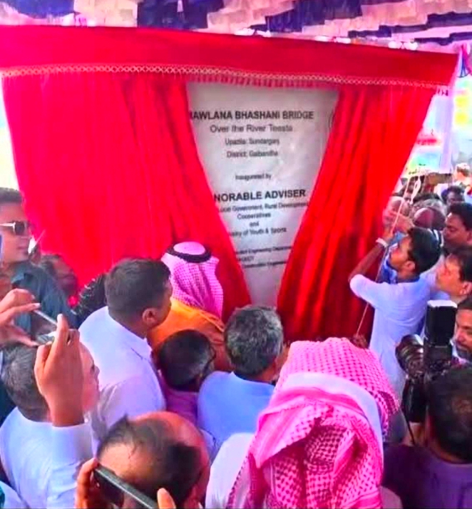 নিজস্ব প্রতিবেদকঃ গাইবান্ধা জেলার সুন্দরগঞ্জ উপজেলাধীন পাঁচপীর বাজার- কুড়িগ্রাম জেলার চিলমারী উপজেলা সদর দপ্তরের সাথে সংযোগকারী সড়কে তিস্তা নদীর উপর নির্মিত ১ হাজার ৪৯০ মিটার দীর্ঘ মওলানা ভাসানী সেতুর ফলক ও ম্যুরাল উন্মোচন করে শুভ উদ্বোধন করেন স্থানীয় সরকার, পল্লী উন্নয়ন ও সমবায় মন্ত্রণালয় এবং যুব ও ক্রীড়া মন্ত্রণালয়ের দায়িত্তে নিয়োজিত উপদেষ্টা আসিফ মাহমুদ সজীব ভূঁইয়া। সেতুর দক্ষিনে প্রান্তে চৌরাস্তার মোড়ে উপজেলা প্রশাসনের আয়োজনে সেতু উদ্বোধনোত্তর এক মতবিনিময় সভায় প্রধান অতিথি ছিলেন উপদেষ্টা আসিফ মাহমুদ সজীব ভূঁইয়া