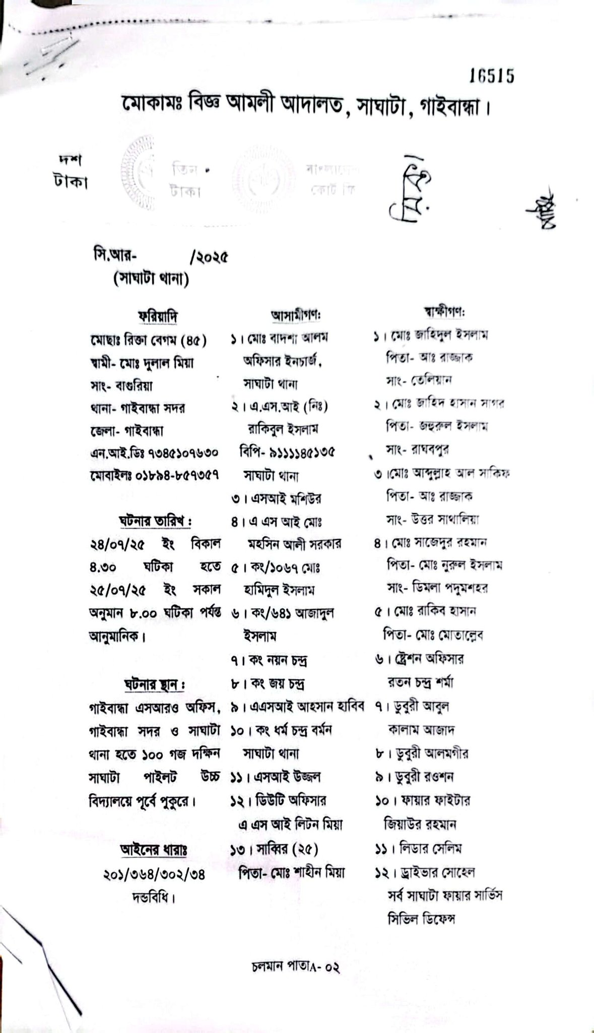 মামলায় অভিযোগ করা হয়, গত ২৪ জুলাই বিকেলে গাইবান্ধা সাব রেজিষ্ট্রি অফিস চত্বর থেকে সিজুকে সাঘাটা থানায় ডেকে নেয় পুলিশ। থানায় নির্যাতনের পর মৃতপ্রায় সিজুকে থানা সংলগ্ন পুকুরে ফেলে দেয়া হয়। পরে পুকুরে লাঠি দিয়ে আঘাত করে তাকে হত্যা করা হয়। পরদিন সকালে ওই পুকুর থেকে সিজুর মরদেহ উদ্ধার করা হয়।