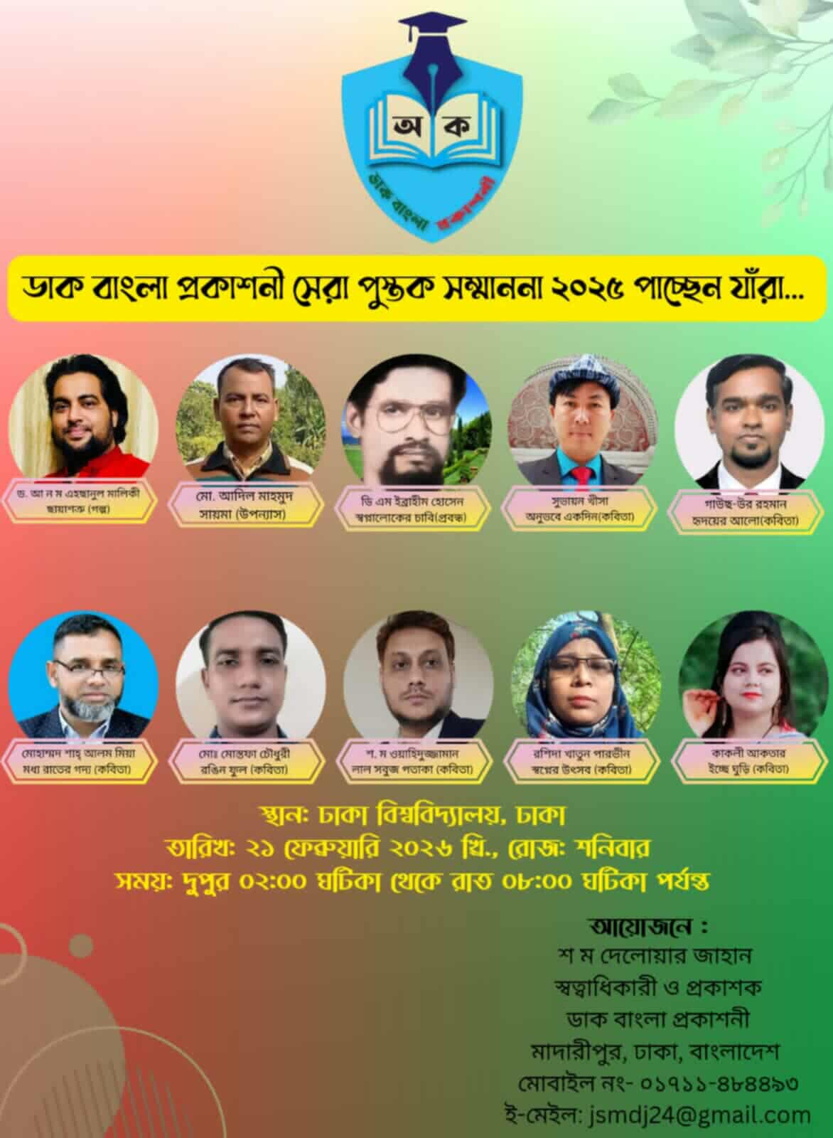 শুভেচ্ছা জানবেন। ডাক বাংলা প্রকাশনী’র ৫ম বর্ষপূর্তি ২০২৫ উদযাপন উপলক্ষ্যে আয়োজিত “ডাক বাংলা প্রকাশনী সেরা পুস্তক সম্মাননা ২০২৫” সেরা ১০ একক গ্রন্থ নির্বাচন ইভেন্টে বিজয়ী সেরা ১০ জন কবি/লেখকগণকে অ্যাওয়ার্ড ও সম্মাননা সনদপত্র আগামী ২১ ফেব্রুয়ারি ২০২৬ খ্রি. রোজ শনিবার দুপুর ০২:০০ ঘটিকা থেকে রাত ০৯:০০ ঘটিকা পর্যন্ত ঢাকা বিশ্ববিদ্যালয়, ঢাকায় আনুষ্ঠানিকভাবে প্রদান করা হবে।
