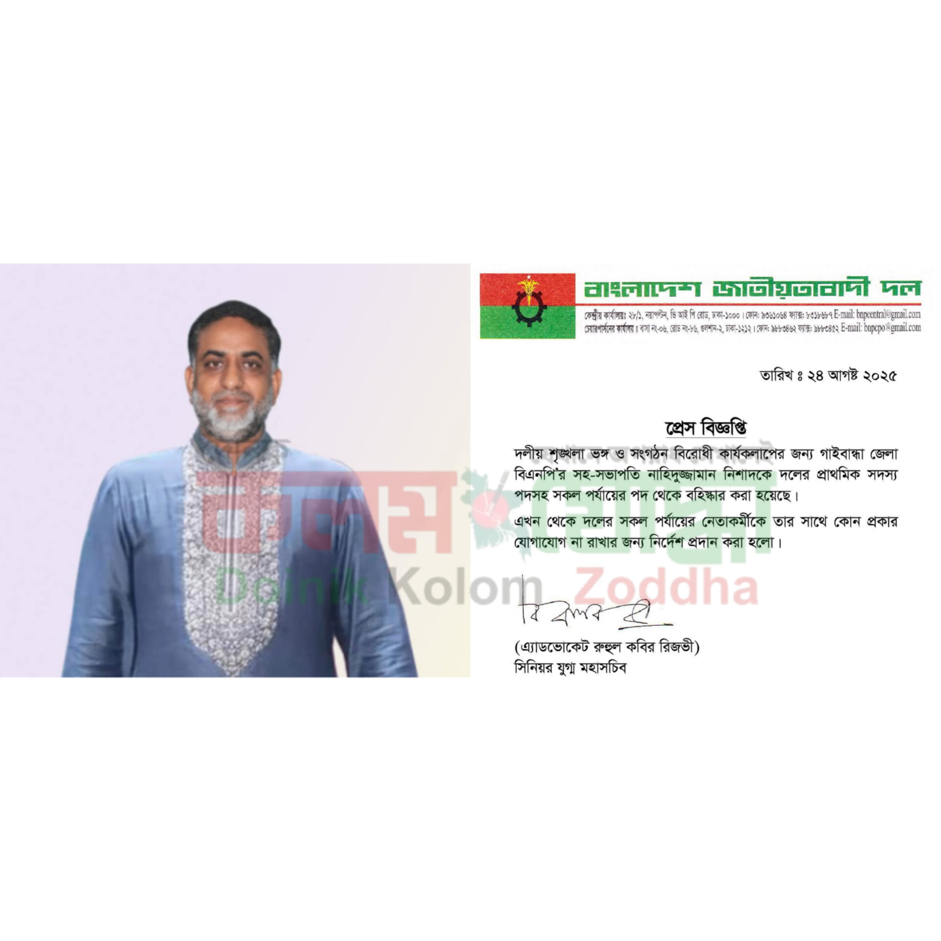 বিজ্ঞপ্তিতে বলা হয়, নিশাদকে দলের প্রাথমিক সদস্য পদসহ সকল পর্যায়ের পদ থেকে বহিষ্কার করা হয়েছে। একই সঙ্গে এখন থেকে দলের কোনো পর্যায়ের নেতাকর্মীর সঙ্গে তার কোনো ধরনের যোগাযোগ না রাখার নির্দেশ প্রদান করা হয়েছে।