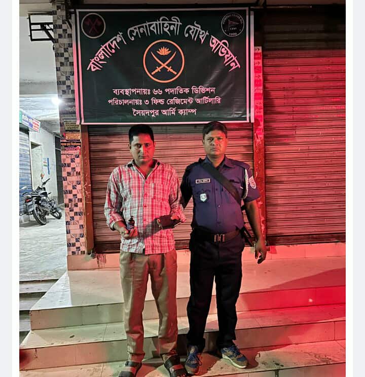 কিশোরগঞ্জ প্রতিনিধি: ফেন্সিডিলসহ যুবক আটক নীলফামারীর কিশোরগঞ্জে ফেন্সিডিলসহ নাজির হোসেন (৩৫) নামে এক যুবককে আটক করেছে যৌথবাহিনি। রবিবার (২৪ আগস্ট) রাত ১১ টার দিকে উপজেলা স্বাস্থ্য কমপ্লেক্সের সামন থেকে তাকে আটক করা হয়। নাজির হোসেন সদর ইউনিয়নের ইসমাইল যদুমনি এলাকার মৃত আফজাল হোসেনের ছেলে। জানা গেছে, সেনাবাহিনীর ৩ ফিল্ড রেজিমেন্ট আর্টিলারির একটি দল গোপন সংবাদের ভিত্তিতে এই অভিযান পরিচালনা করে। অভিযানে নেতৃত্ব দেন রেজিমেন্ট আর্টিলারির ক্যাপ্টেন মুরসালুল জুমার। অভিযানকালে পুলিশও সেনাবাহিনীকে সহযোগিতা করেন। পুলিশ সূত্রে জানা যায়, অভিযুক্ত নাজির দীর্ঘদিন ধরে মাদক ব্যবসা করে আসছিলেন। এতে গতকাল রাতে গোপন সংবাদের ভিত্তিতে যৌথবাহিনি অভিযান চালিয়ে তাকে এক বোতল ফেন্সিডিলসহ আটক করেন। এতে তারসঙ্গে থাকা দুটি মোবাইল, একটি মোটরসাইকেল ও চারটি সিম উদ্ধার করা হয়। এবিষয়ে থানা পুলিশের ভারপ্রাপ্ত কর্মকর্তা (ওসি) আশরাফুল ইসলাম বলেন, নাজির হোসেন দীর্ঘদিন ধরে মাদক ব্যবসা করে আসছিলেন। গতকাল রাতে অভিযান চালিয়ে তাকে আটক করা হয়। তার বিরুদ্ধে মাদক নিয়ন্ত্রণ আইনে মামলা দায়ের করে তাকে আদালতে পাঠানো হবে।