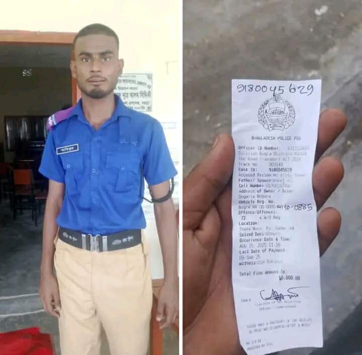 বগুড়ায় এক চাঞ্চল্যকর ঘটনার জন্ম দিয়েছে ট্রাফিক পুলিশের অমানবিক আচরণ। সোমবার দুপুরে শহরের কেন্দ্রস্থলে দায়িত্ব পালনকালে গ্রাম পুলিশ সদস্য আতিকুর রহমান হেলমেট ছাড়া মোটরসাইকেল চালানোর অভিযোগে ট্রাফিক পুলিশ আলমগীর হোসেন তার কাছ থেকে ১০ হাজার টাকা জরিমানা আদায় করেন। শুধু জরিমানাই নয়, ঘটনাস্থলেই আতিকুরের ইউনিফর্ম ছিঁড়ে ফেলা হয় এবং প্রকাশ্যে তাকে ‘আওয়ামী লীগের দোসর’ বলে গালিগালাজ করেন ওই ট্রাফিক পুলিশ সদস্য।