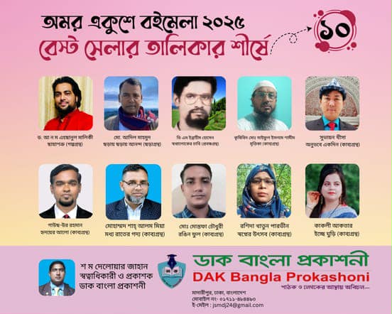 মোঃ শফিকুল ইসলাম,নিজস্ব প্রতিবেদকঃ শুভেচ্ছা জানবেন। বাংলা একাডেমি কর্তৃক আয়োজিত অমর একুশে বইমেলা ২০২৫ সোহরাওয়ার্দী উদ্যান, ঢাকায় ফেব্রুয়ারি মাসে অনুষ্ঠিত মাসব্যাপী বইমেলায় ডাক বাংলা প্রকাশনী কর্তৃক মুদ্রিত ১০ (দশ) জন লেখকের গল্প, ছড়া, প্রবন্ধ ও কাব্যগ্রন্থগুলো বেস্ট সেলার প্রাপ্ত হওয়ায় অ্যাওয়ার্ড ও সম্মাননা সনদপত্র প্রদানের জন্য গতকাল ২৮ আগস্ট ২০২৫ খ্রি. রোজ বৃহস্পতিবার বিকাল ০৫:০০ ঘটিকায় প্রকাশনীর কার্যালয়ে কেন্দ্রীয় কমিটির সিদ্ধান্ত মোতাবেক গৃহীত হয়। আগামী ২১ ফেব্রুয়ারি ২০২৬ খ্রি. রোজ শনিবার দুপুর ০২:০০ ঘটিকা থেকে রাত ০৯:০০ ঘটিকা পর্যন্ত ঢাকা বিশ্ববিদ্যালয়, ঢাকায় ডাক বাংলা প্রকাশনী’র ৫ম বর্ষপূর্তি ২০২৫ অনুষ্ঠানে বেস্ট সেলার অ্যাওয়ার্ড ও সম্মাননা সনদপত্র আনুষ্ঠানিকভাবে প্রদান করা হবে। বেস্ট সেলার অ্যাওয়ার্ড প্রাপ্ত সেরা ১০ তালিকার শীর্ষে যারা