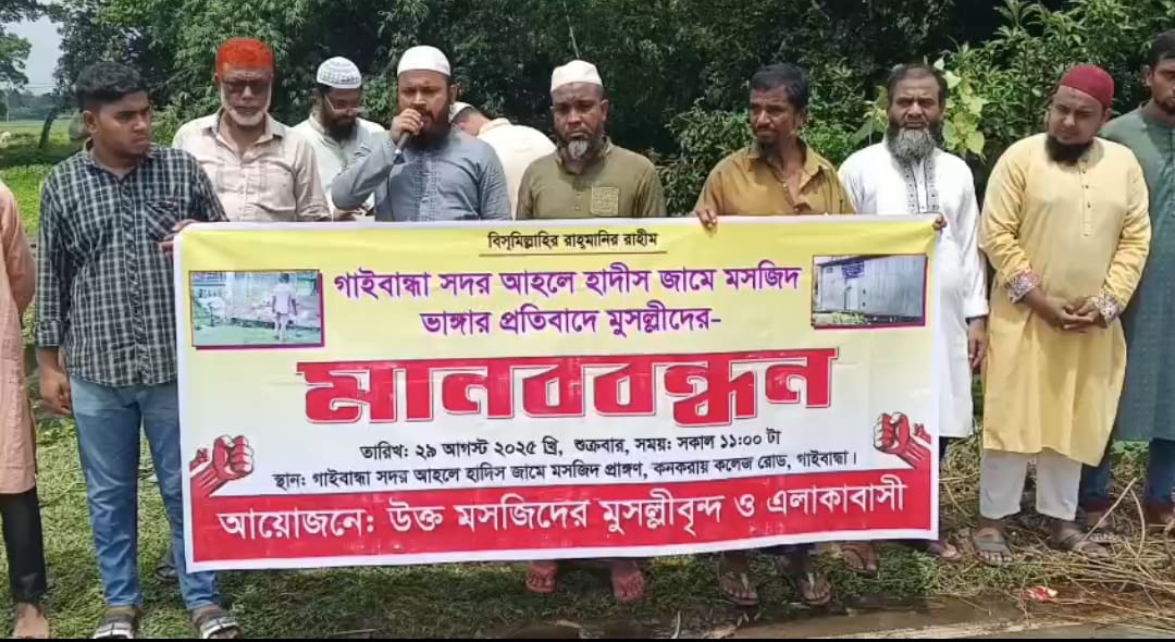 মোঃ মিঠু মিয়া,গাইবান্ধা প্রতিনিধি: গাইবান্ধায় যুবলীগ নেতা কর্তৃক মসজিদ ভাঙচুরের অভিযোগে মুসল্লী ও এলাকাবাসীর আয়োজনে মানববন্ধন অনুষ্ঠিত হয়েছে।শুক্রবার দুপুরে সদর উপজেলার নাকাইহাট–গাইবান্ধা সড়কের কনকরায় আহলে হাদীস জামে মসজিদের সামনে এ মানববন্ধন অনুষ্ঠিত হয়।মানববন্ধনে অংশগ্রহণকারীরা অভিযোগ করেন, যুবলীগ নেতা ও মসজিদের সাবেক ক্যাশিয়ার মাসুম মিয়ার কাছে মসজিদের প্রায় ১৬ লাখ টাকা জমা ছিল। দীর্ঘদিন ধরে ওই টাকা ফেরত না দিয়ে তিনি তালবাহানা করে আসছিলেন। এ নিয়ে মসজিদ কমিটি ও মুসল্লীদের সঙ্গে তার বিরোধ চলছিল।বক্তারা জানান, এরই ধারাবাহিকতায় বৃহস্পতিবার দুপুরে আওয়ামী লীগ সমর্থিত কিছু লোক নিয়ে এসে মসজিদটি ভাঙচুর করেন মাসুম। তারা আরও অভিযোগ করেন, মসজিদ ভাঙচুরের সময় বাধা দিলে মাসুমের লোকজন তাদের ওপর হামলা চালায়। এ ঘটনায় পুলিশকে জানালেও কোনো ব্যবস্থা নেওয়া হয়নি।মানববন্ধনে বক্তারা মসজিদের টাকা ফেরত, ক্ষতিপূরণ এবং দোষীদের দৃষ্টান্তমূলক শাস্তির দাবি জানান। সেই সঙ্গে দ্রুত ভাঙচুরকারীদের গ্রেপ্তারের আহ্বান জানান তারা।