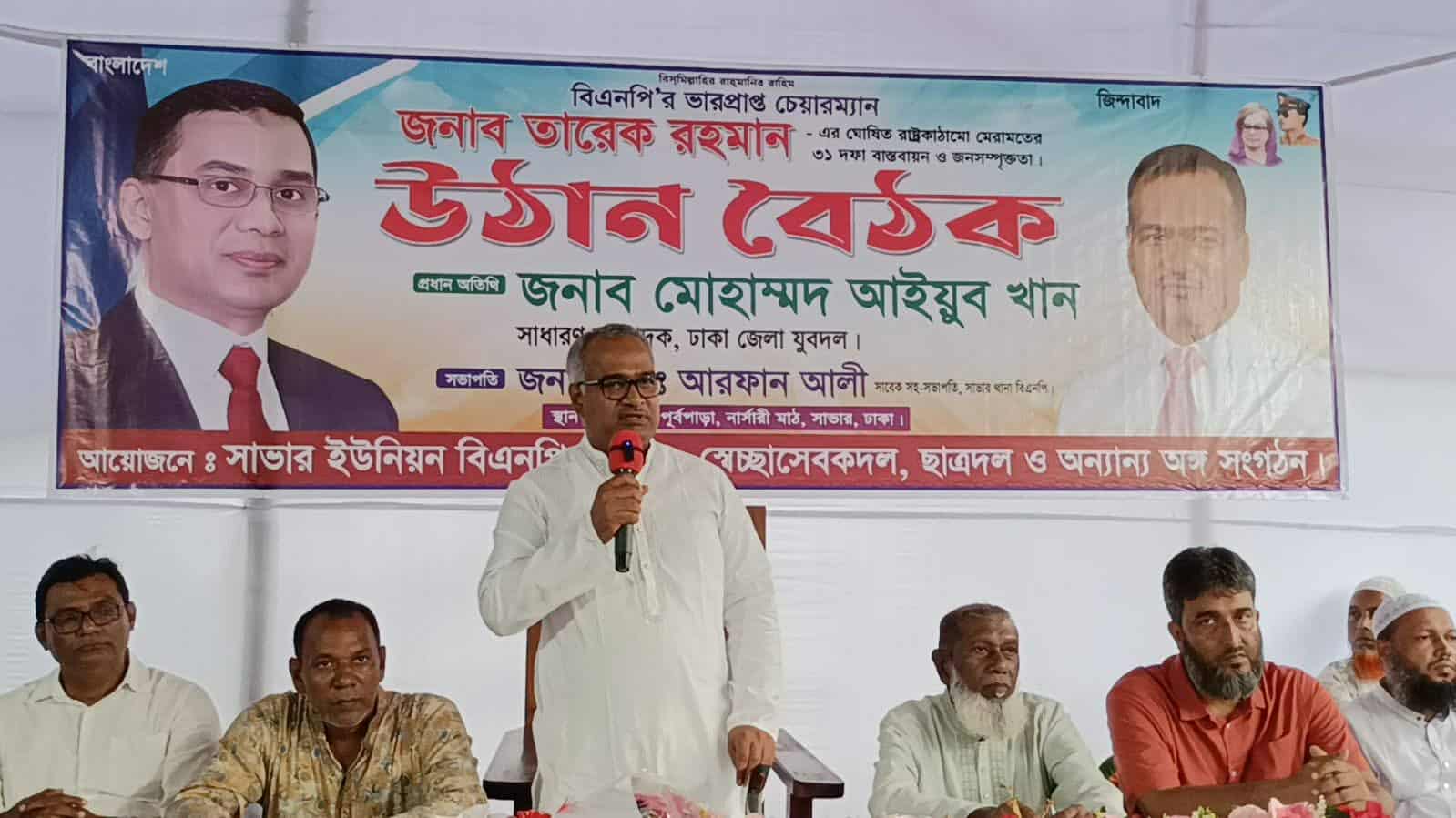 সাভারে বিএনপির ভারপ্রাপ্ত চেয়ারম্যান তারেক রহমান ঘোষিত রাষ্ট্র কাঠামো মেরামতের ৩১ দফা বাস্তবায়নের লক্ষ্যে উঠান বৈঠক অনুষ্ঠিত হয়েছে। শনিবার (৩০ আগস্ট) বিকেলে সাভার সদর ইউনিয়নের দেওগাঁও এলাকায় এ অনুষ্ঠানের আয়োজন করা হয়।