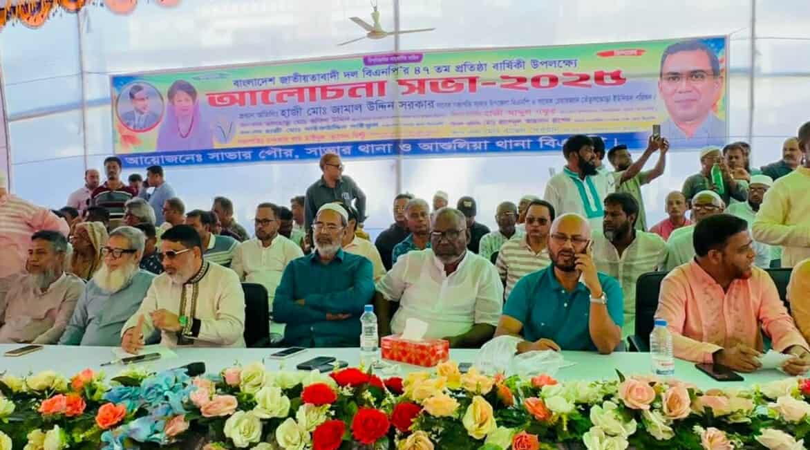 মোঃ রুবেল হোসেন (সাভার) ঢাকা : বাংলাদেশ জাতীয়তাবাদী দলের (বিএনপি) ৪৭তম প্রতিষ্ঠাবার্ষিকী উপলক্ষে সাভার থানা, সাভার পৌরসভা ও আশুলিয়া থানা বিএনপির যৌথ উদ্যোগে আলোচনা সভা অনুষ্ঠিত হয়েছে। বুধবার (৩ সেপ্টেম্বর) বিকেলে সাভার পৌরসভা ঈদগাহ মাঠে এ অনুষ্ঠান অনুষ্ঠিত হয়। সভায় সভাপতিত্ব করেন সাভার পৌরসভা বিএনপির সভাপতি খন্দকার শাহ মঈনুল হোসেন বিল্টু। অনুষ্ঠানে প্রধান অতিথি হিসেবে উপস্থিত ছিলেন সাভার উপজেলা বিএনপির সাবেক সভাপতি হাজী জামাল উদ্দিন সরকার। বিশেষ অতিথি ছিলেন সাভার উপজেলা বিএনপির সাবেক সাধারণ সম্পাদক কফিল উদ্দিন, ঢাকা জেলা শ্রমিক দলের সভাপতি হাজী দ্বিন ইসলাম, সাভার পৌরসভা বিএনপির সাবেক সভাপতি রেফাত উল্লাহ, সাভার থানা বিএনপির সভাপতি সাইফুদ্দীন সাইফুল, আশুলিয়া থানা বিএনপির সাধারণ সম্পাদক আব্দুল গফুর মিয়া, ঢাকা জেলা বিএনপির সাবেক সাংগঠনিক সম্পাদক রাসেদুল আহসান রাশেদ, আশুলিয়া থানা বিএনপির সহ-সভাপতি বাসেদ দেওয়ানসহ বিভিন্ন অঙ্গ ও সহযোগী সংগঠনের নেতৃবৃন্দ। আলোচনা সভায় প্রধান অতিথি তাঁর বক্তব্যে বলেন, “আগামী নির্বাচনে ধানের শীষের প্রার্থী যাকে দল মনোনয়ন দেবে, তার পক্ষেই ঐক্যবদ্ধ থেকে কাজ করতে হবে। দলকে সুসংগঠিত রাখতে সবাইকে একসঙ্গে কাজ করার আহ্বান জানাই।” অনুষ্ঠানে সাভার ও আশুলিয়ার বিভিন্ন ইউনিট থেকে বিপুলসংখ্যক বিএনপি ও অঙ্গসংগঠনের নেতাকর্মীরা অংশগ্রহণ করেন।
