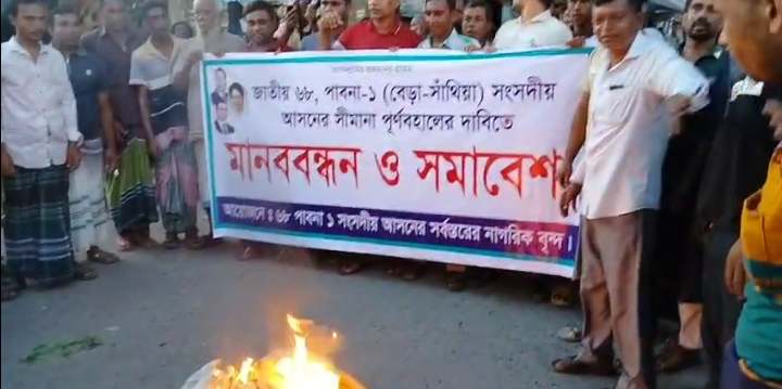 এস এম আলমগীর চাঁদ, বিশেষ প্রতিনিধি : পাবনার বেড়ায় ৬৮ পাবনা ১ (সাঁথিয়া- বেড়া)আসন কে ভেঙে দ্বিখন্ডিত করে নির্বাচন কমিশনের( ইসি) কর্তৃক প্রকাশ করা তালিকা বাতিল এবং পুনর্বহালের দাবিতে এক মানব বন্ধন অনুষ্ঠিত হয়েছে। ৫ ই সেপ্টেম্বর (শুক্রবার) বিকেলে উপজেলার পেঁচাকোলা চারমাথা মোড়ে এ মানববন্ধন অনুষ্ঠিত হয়। পাবনা ১ নির্বাচনী এলাকা পুনরুদ্ধার বাস্তব কমিটির ব্যানারে বিএনপি ও এর বিভিন্ন অঙ্গ সংগঠনের নেতাকর্মীরা এ কর্মসূচি পালন করেন। এতে পাবনা ১( সাঁথিয়া – বেড়া) নির্বাচনী এলাকার বিএনপি এবং এর বিভিন্ন অঙ্গ সংগঠনের কয়েক হাজার নেতাকর্মী অংশগ্রহণ করেন। এ সময় তারা আওয়াজ তুলেন নির্বাচন কমিশনের সিদ্ধান্ত মানি না মানবো না, আসন পুনর্গঠন এর সিদ্ধান্ত বাতিল কর করতে হবে, সাবেক পাবনা ১ নির্বাচনের এলাকা ফিরিয়ে দাও দিতে হবে। মানববন্ধনে অংশগ্রহণকারী বিএনপি নেতাকর্মীরা হুঁশিয়ারি দিয়ে বলেন পাবনা ১ (সাঁথিয়া – বেড়া)এলাকা নিয়ে সাবেক পাবনা ১ আসন কি ফিরিয়ে দাও দিতে হবে। নির্বাচন কমিশনের এই খসড়া বাতিল করতে হবে। যদি আসন ফিরিয়ে দেওয়া না হয় তাহলে যথাযথ আন্দোলনের মাধ্যমে আসন ফিরিয়ে আনার ব্যবস্থা গ্রহণ করা হবে। স্বাধীনতার পর থেকে পাবনা ১ (সাথিয়া- বেড়া )আসনটি সাঁথিয়া উপজেলা এবং বেড়ার আংশিক এলাকা নিয়ে গঠিত ছিল। কিন্তু সম্প্রতি নির্বাচন কমিশন কর্তৃক প্রকাশিত খসরায় সাঁথিয়া কেআলাদা করে পাবনা ১ এবং বেড়া উপজেলাকে সুজানগরের সাথে সম্পৃক্ত করে পাবনা ২ আসনের সীমানা নির্ধারণ করা হয়। এতে সাধারণ জনগণ এবং বিভিন্ন রাজনৈতিক নেতৃবৃন্দের ভিতর ব্যাপক ক্ষোভের সৃষ্টি হয়। তাই তারা আসন টি পুনর্বহালের দাবিতে মানববন্ধন সহ বিভিন্ন কর্মসূচি পালন করে আসছে।