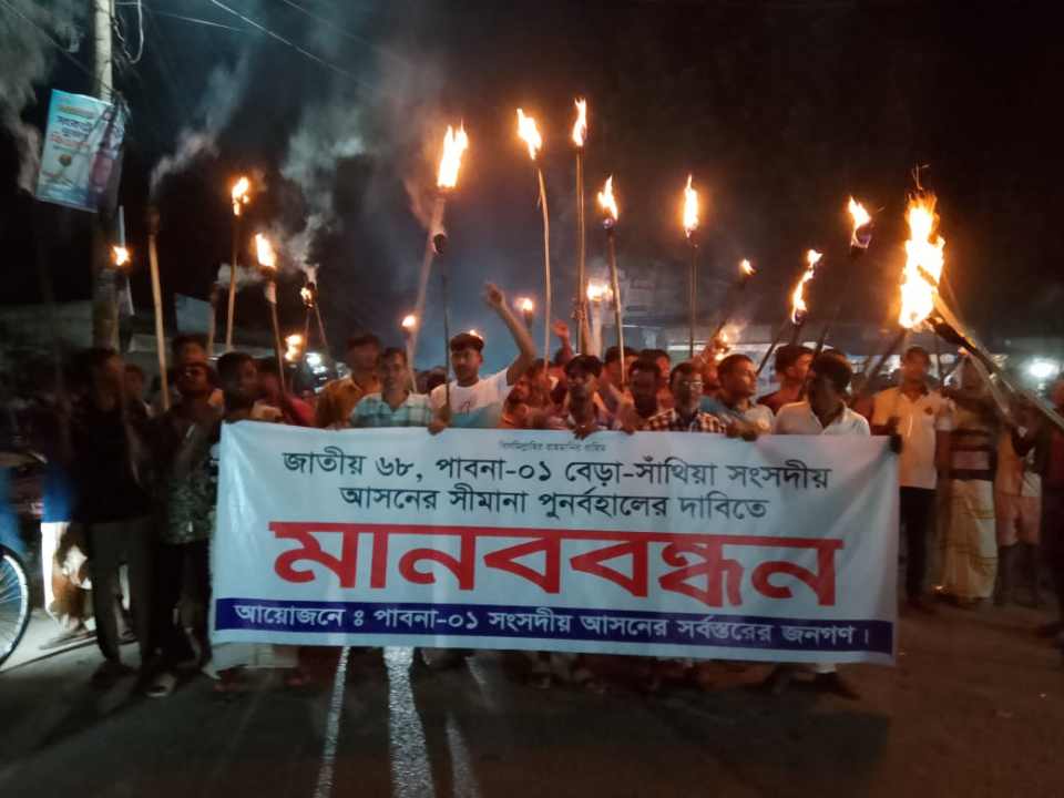 ৬ ই সেপ্টেম্বর (শনিবার) সন্ধ্যায় উপজেলার বেড়া বাজার, বেড়া ডাকবাংলো, এবং মোহনগঞ্জ বাজারে এ বিক্ষোভ সমাবেশ ও মশাল মিছিল অনুষ্ঠিত হয়। সমাবেশে বক্তারা উল্লেখ করেন, স্বাধীনতার পর থেকে ৬৮ পাবনা ১ আসন টি সাঁথিয়া উপজেলা এবং বেড়া উপজেলার কিছু অংশ নিয়ে গঠিত ছিল। সম্প্রতি নির্বাচন কমিশন কর্তৃক প্রকাশিত খসড়ায় সাঁথিয়া কে আলাদা করে পাবনা ১ এবং বেড়া উপজেলাকে সুজানগরের সাথে সম্পৃক্ত করে পাবনা ২ আসন বন্টন করা হয়েছে। এতে সাধারণ জনগণ এবং রাজনৈতিক নেতৃবৃন্দের ভিতরে ব্যাপক ক্ষোভের সৃষ্টি হয়। বক্তাগণ খুব দ্রুত পাবনা ১ আসনটি পুনর্বহাল করার জোর দাবি জানান।