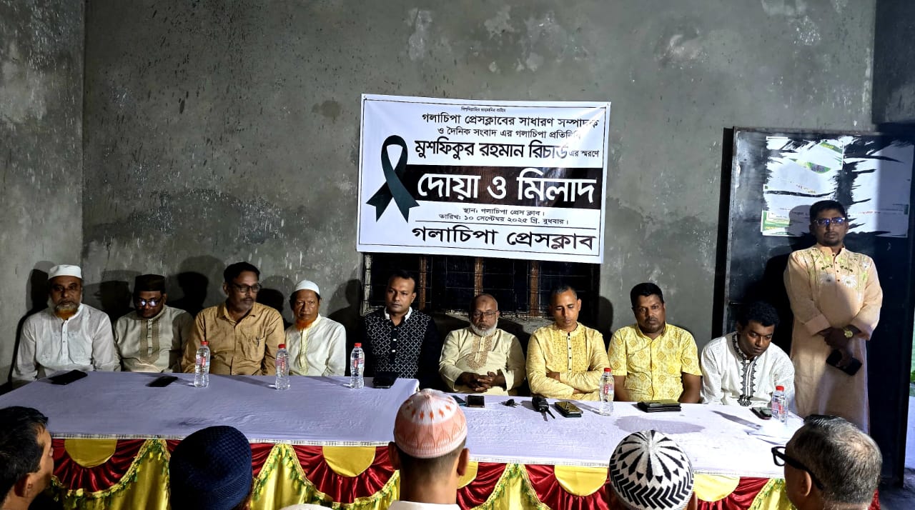 গলাচিপা (পটুয়াখালী) প্রতিনিধি: গলাচিপা প্রেসক্লাবের সাধারণ সম্পাদক ও দৈনিক সংবাদের উপজেলা প্রতিনিধি মুশফিকুর রহমান রিচার্ডের স্মরণে দোয়া-মিলাদ ও আলোচনা সভা অনুষ্ঠিত হয়েছে। বুধবার (১০ সেপ্টেম্বর) বিকাল ৫টায় গলাচিপা প্রেসক্লাব কার্যালয়ে এ অনুষ্ঠানের আয়োজন করা হয়। অনুষ্ঠানে প্রধান অতিথি ছিলেন উপজেলা নির্বাহী কর্মকর্তা মাহামুদুল হাসান। বিশেষ অতিথি হিসেবে উপস্থিত ছিলেন—বাংলাদেশ জামায়াতে ইসলামী বরিশাল বিভাগীয় টিম সদস্য ও সাবেক জেলা আমীর অধ্যাপক মু. শাহ আলম, গলাচিপা থানার অফিসার ইনচার্জ মো. আশাদুর রহমান, রিচার্ডের বাবা ও গলাচিপা উপজেলা বিএনপির সভাপতি বীর মুক্তিযোদ্ধা মো. সিদ্দিকুর রহমান, গণ অধিকার পরিষদের আহ্বায়ক মো. হাফিজুর রহমান, পল্লী বিদ্যুৎ গলাচিপা জোনাল অফিসের ডেপুটি জেনারেল ম্যানেজার মো. ছিদ্দিকুর রহমান তালুকদার এবং প্রকল্প বাস্তবায়ন কর্মকর্তা মো. জাফর রানা।