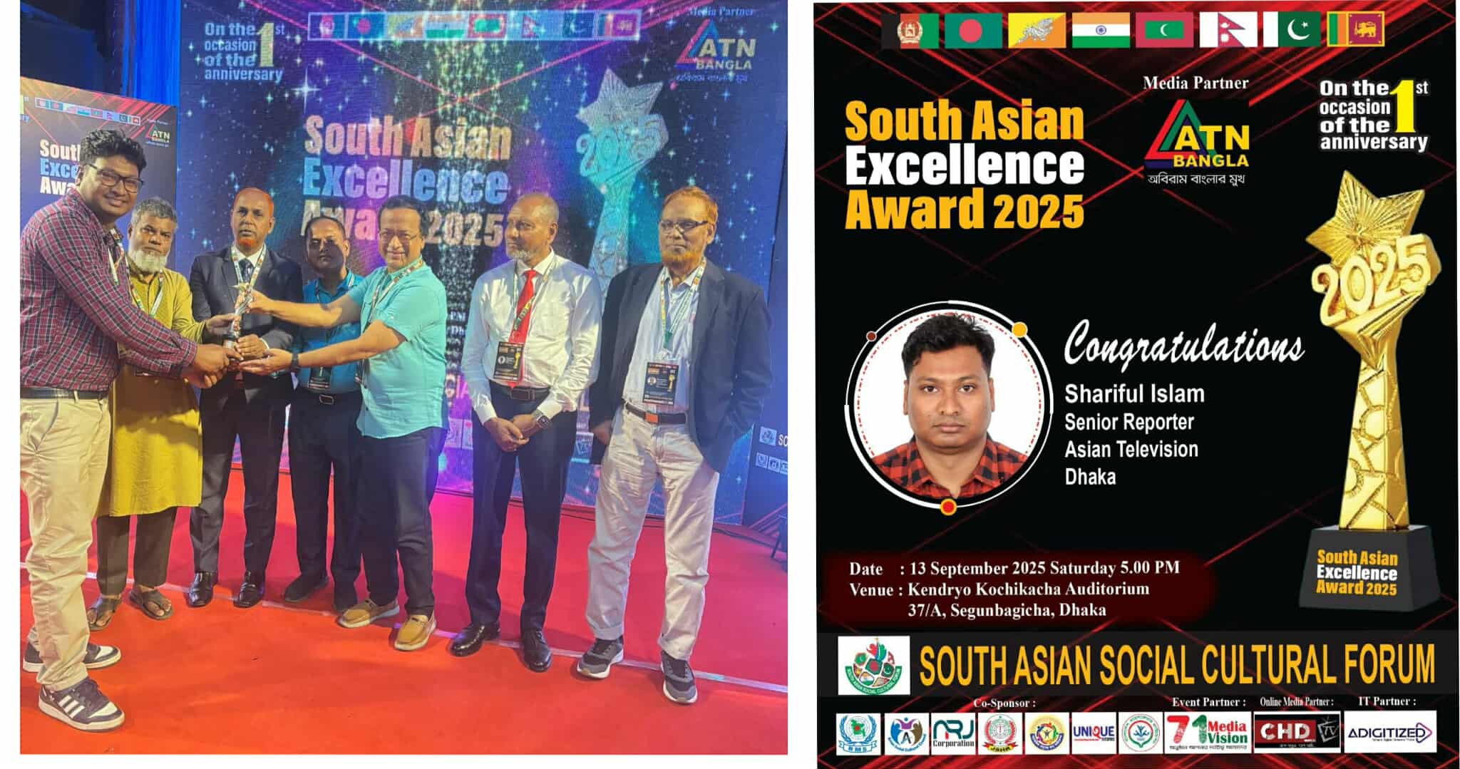 সাংবাদিকতার অঙ্গনে বিশেষ অবদান রাখার স্বীকৃতি স্বরূপ সিনিয়র সাংবাদিক শরিফুল ইসলাম শরীফ ‘সাউথ এশিয়ান এক্সিলেন্স অ্যাওয়ার্ড ২০২৫’-এ ভূষিত হয়েছেন। দক্ষিণ এশিয়ার বিভিন্ন দেশ থেকে মনোনীত গুণীজনদের মধ্য থেকে তাঁকে এই সম্মাননা প্রদান করেছে ‘সাউথ এশিয়ান সোশ্যাল কালচারাল ফোরাম’।