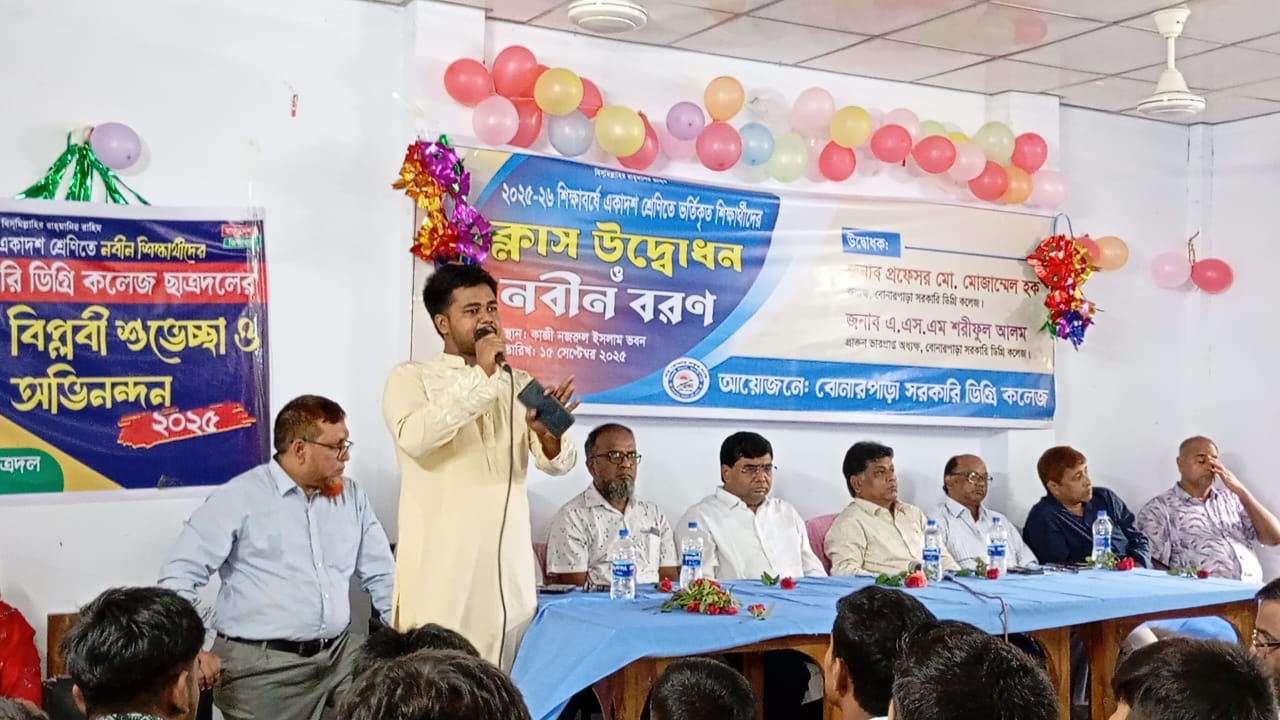 বোনারপাড়া সরকারি ডিগ্রি কলেজ, বোনারপাড়া,সাঘাটা,গাইবান্ধায় ১৫ই সেপ্টেম্বের ২০২৫ইং রোজ: সোমবার বোনারপাড়া সরকারি ডিগ্রি কলেজে একাদশ শ্রেণিতে নবভর্তিকৃত শিক্ষার্থীদের জন্য এক বর্ণাঢ্য ক্লাস উদ্বোধন ও নবীন বরণ অনুষ্ঠান আজ [তারিখ] তারিখে বিদ্যালয়ের অডিটোরিয়ামে অনুষ্ঠিত হয়েছে। উৎসবমুখর পরিবেশে নবীন শিক্ষার্থীদের বরণ করে নেয় শিক্ষা প্রতিষ্ঠানটি।