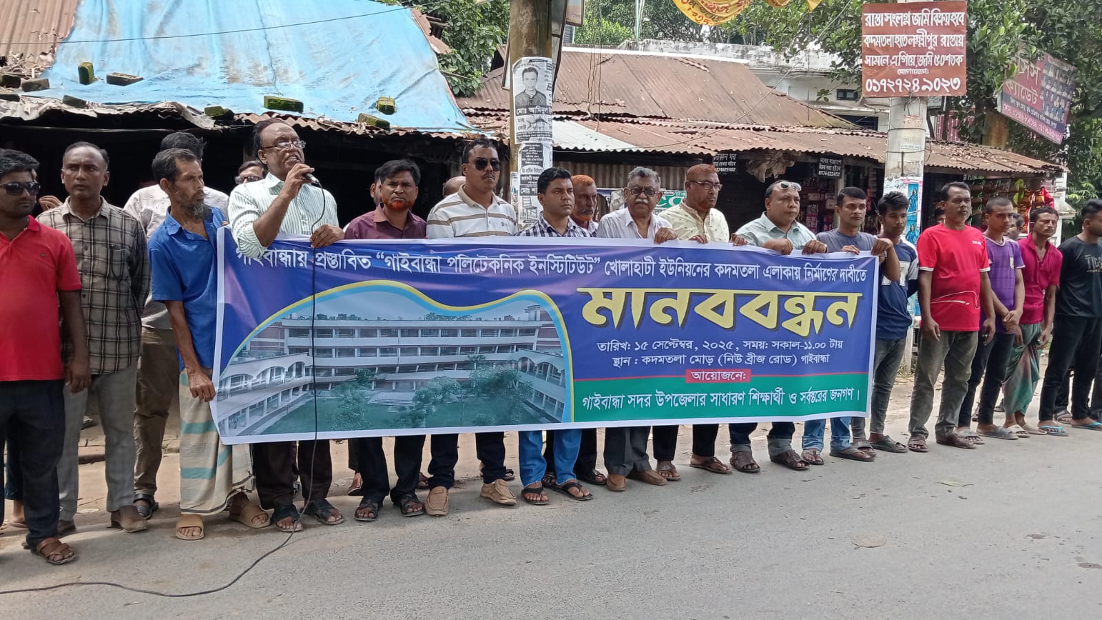মোঃ মিঠু মিয়া,গাইবান্ধা প্রতিনিধি: গাইবান্ধায় প্রস্তাবিত গাইবান্ধা পলিটেকনিক ইনস্টিটিউট পূর্ব নির্ধারিত খোলাহাটী ইউনিয়নের টিটিসি সংলগ্ন এলাকায় স্থাপনের দাবীতে মানববন্ধন অনুষ্ঠিত হয়েছে।