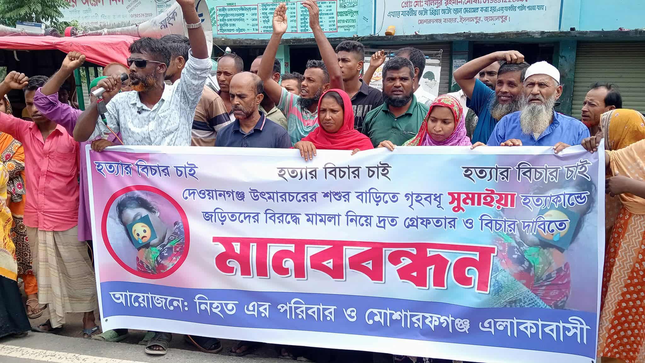 মোঃ শামীম মিয়া ,স্টাফ রিপোর্টার : জামালপুরের দেওয়ানগঞ্জে শশুর বাড়িতে গৃহবধূ সুমাইয়া হত্যা ঘটনায় পুলিশ মামলা নিয়ে সুষ্ঠু তদন্তে জড়িতদের দ্রুত গ্রেফতার ও বিচার দাবি তে মানববন্ধন অনুষ্ঠিত হয়েছে। মঙ্গলবার (১৬ সেপ্টেম্বর) দুপুরের দেওয়ানগঞ্জ- ইসলামপুর মহাসড়কে মোশারফগঞ্জে নিহতের স্বজন- এলাকাবাসী মানববন্ধনটি আয়োজন করে। মানববন্ধন চলাকালে নিহত সুমাইয়ার মা নিলুফা বেগম বলেন, “আমার মেয়ের স্বাভাবিক মৃত্যু হয়নি, তাকে হত্যা করা হয়েছে। বিয়ের পর থেকেই তার উপর নির্যাতন করে আসছিল তার স্বামী-শশুর বাড়ির লোকজন। আমি এর সুষ্ঠু বিচার চাই। ঘটনার সাথে জড়িতদের পুলিশ থানায় নিয়ে কেন ছেড়ে দিল। এছাড়াও মানববন্ধনে নিহতের স্বজন উজ্জ্বল,জাকির হোসেন,শওকতসহ এলাকাবাসীর অভিযোগ, সুমাইয়ার হত্যা ঘটনা পুলিশ মামলা নিতে গড়িমসি করছে কেন? আমরা চাই পুলিশ মামলা নিয়ে ঘটনার সুষ্ঠু তদন্ত করে জড়িতদের দ্রুত গ্রেফতার করে সঠিক বিচারের আওতায় আনা হোক। উল্লেখ যে, গত বৃহস্পতিবার (১১সেপ্টেম্বর) ভোররাতে ৯৯৯ নম্বরে ফোন পেয়ে দেওয়ানগঞ্জ থানা পুলিশ পাশ্ববর্তী দেওয়ানগঞ্জ উপজেলার বীর উৎমারচর গ্রামের শ্বশুরবাড়ি থেকে সুমাইয়ার মরদেহ উদ্ধার করে। শুক্রবার ময়নাতদন্তের জন্য জামালপুর জেনারেল হাসপাতাল মর্গে প্রেরণ করে। নিহত সুমাইয়া ইসলামপুর উপজেলার মোশারফগঞ্জ তেঘুরিয়া গ্রামের মৃত শহিদের মেয়ে। প্রায় আট মাস আগে পার্শ্ববতী দেওয়ানগঞ্জ সদর ইউনিয়নের বীর উৎমারচর গ্রামের সোনা মিয়ার ছেলে সুমন (২২) এর সাথে তার বিয়ে হয়। গত ১১সেপ্টেম্বর ভোররাতে শ্বশুরবাড়িতে সুমাইয়ার রহস্য জনক মৃত্যু হয়। এই ঘটনায় এলাকাবাসীর সহায়তা পুলিশ জিজ্ঞাসাবাদের জন্য ঘটনার দিন সুমাইয়ার স্বামী সুমন, তার বাবা সোনাজ উদ্দিন ও মা খালেদাকে আটক করে থানায় নিলেও তিন দিন পর ছেড়ে দেওয়া হয়। এব্যাপারে দেওয়ানগঞ্জ মডেল থানার ভারপ্রাপ্ত কর্মকর্তা (ওসি) মো.নাজমুল হাসান জানান,ঘটনাটি তদন্তাধীন রয়েছে। ময়নাতদন্তের প্রতিবেদন পেলেই মামলা নেওয়া হবে। মৃত্যুর সঠিক কারণ জানা যাবে।”