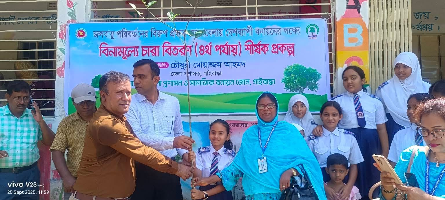 মোঃ মিঠু মিয়া,গাইবান্ধা প্রতিনিধি: জলবায়ুর বিরূপ প্রভাব মোকাবেলায় বৃক্ষরোপণকে উৎসাহিত করতে গাইবান্ধায় বিনামূল্যে চারা বিতরণ কর্মসূচি অনুষ্ঠিত হয়েছে। বৃহস্পতিবার ২৫ সেপ্টেম্বর গাইবান্ধা পৌরসভার কলেজিয়েট মডেল সরকারি প্রাথমিক বিদ্যালয় প্রাঙ্গণে এ কর্মসূচির আয়োজন করা হয়।