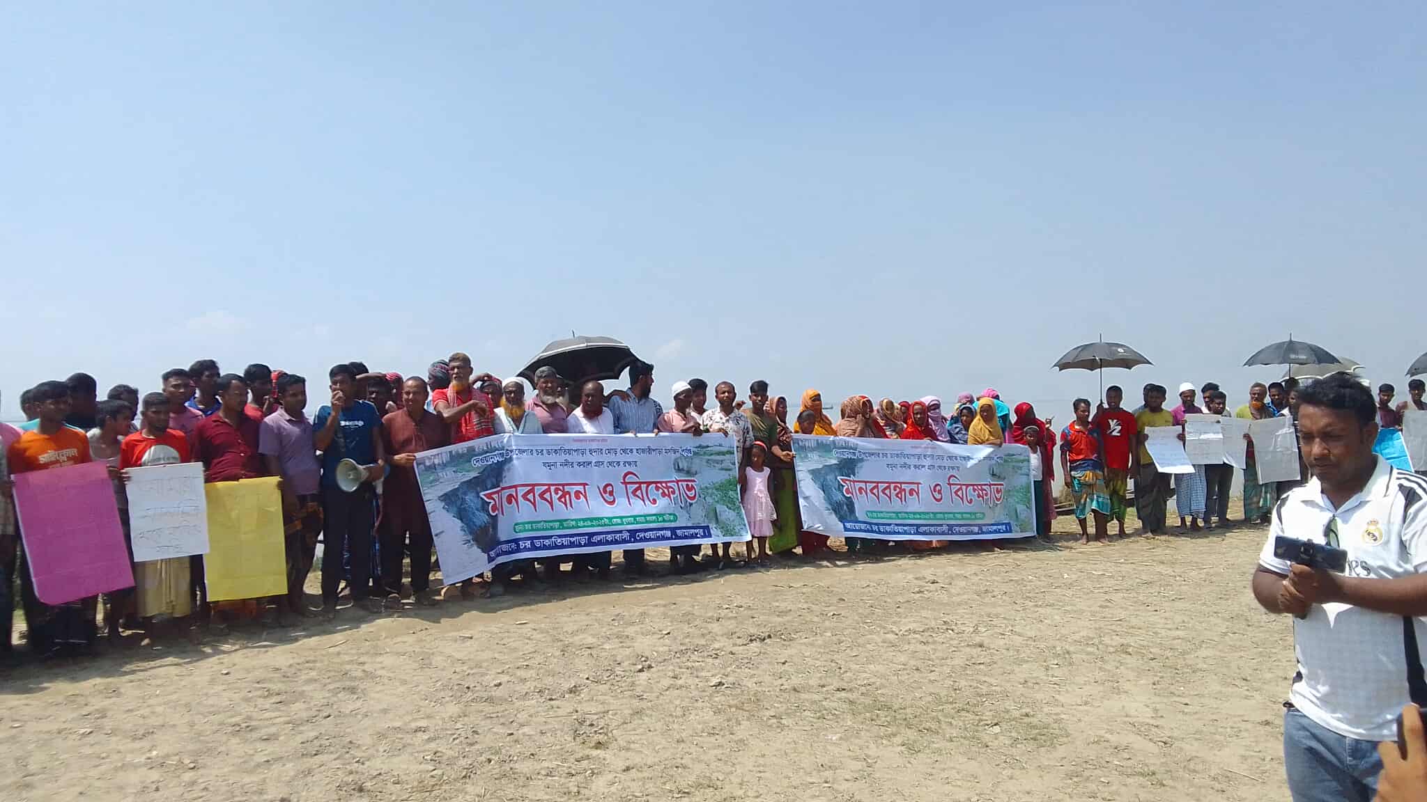মোঃ শামীম মিয়া ,স্টাফ রিপোর্টার: জীবনের সমস্ত সঞ্চয় নদীতে ভেসে গেছে। একের পর এক ঘরবাড়ি সরিয়েও রক্ষা নেই। একসময় যে জমিতে সোনালি ধান দুলত, আজ সেখানে যমুনার উত্তাল স্রোত। সন্তানদের ভবিষ্যৎ নিয়ে অজানা আতঙ্ক। এমনই ভয়াবহ পরিস্থিতির মুখোমুখি জামালপুর জেলার দেওয়ানগঞ্জ উপজেলার চিকাজানী ইউনিয়নের চর ডাকাতিয়া পাড়া, হাজারিয়া পাড়া, খোলাবাড়ি ও বড়খাল এলাকার মানুষ। এই ভাঙনরোধে স্থায়ী বাঁধ নির্মাণের দাবিতে বুধবার সকাল ১১টায় যমুনা নদীর তীরে দাঁড়িয়ে মানববন্ধন ও বিক্ষোভ কর্মসূচির আয়োজন করেন স্থানীয়রা। নারী-পুরুষ, বৃদ্ধ-শিশু, শিক্ষক, কৃষক—সবাই হাতে প্ল্যাকার্ড নিয়ে অংশ নেন এ কর্মসূচিতে। স্থানীয়রা জানান, গত কয়েক বছরে যমুনার ভাঙনে শত শত বসতবাড়ি বিলীন হয়ে গেছে। হাজার হাজার একর ফসলি জমি নদীর গর্ভে তলিয়ে গেছে। আরও অসংখ্য জমি ও বসতি এখন ভাঙনের হুমকির মুখে। বিশেষ করে চরমাগুরী হাট সরকারি প্রাথমিক বিদ্যালয়, চর ডাকাতিয়া হাজারি পাড়া সরকারি প্রাথমিক বিদ্যালয়, দেলোয়ার হোসেন হাই স্কুল, একটি কমিউনিটি ক্লিনিক ও একটি ব্রিজসহ গুরুত্বপূর্ণ স্থাপনা।যেকোনো মুহূর্তে নদীগর্ভে চলে যাওয়ার শঙ্কায় রয়েছে। বিদ্যালয়গুলো ভাঙনের কিনারায় দাঁড়িয়ে থাকায় শিক্ষার্থীরা প্রতিদিন আতঙ্কের মধ্যে ক্লাস করছে। মানববন্ধনে অংশ নেওয়া ক্ষতিগ্রস্ত কৃষক আব্দুল কাদের বলেন, “নদী ভাঙনে আমার তিন বিঘা জমি নদীতে গেছে। গত দুই বছরে আমাকে তিনবার বাড়ি সরাতে হয়েছে। যেখানে আমার পাকা ঘর ছিল, আজ সেখানে নদীর পানি বইছে। ছেলেমেয়েদের নিয়ে এখন খোলা আকাশের নিচে থাকতে হয়। বাঁচার কোনো নিশ্চয়তা নেই। সরকার যদি দ্রুত স্থায়ী বাঁধ না করে, আমরা আরও সর্বস্বান্ত হয়ে যাবো।” চর ডাকাতিয়া হাজারি পাড়া সরকারি প্রাথমিক বিদ্যালয়ের শিক্ষক মোঃখাদিমুল ইসলাম নিজের আতঙ্কের কথা তুলে ধরে বলেন, “আমাদের বিদ্যালয়টি এখন নদীর একদম কিনারায়। প্রতিদিন আমরা দুশ্চিন্তায় থাকি, কখন এটি নদীতে ভেঙে পড়বে। শিশুদের ভবিষ্যৎ নিয়ে আমি ভীষণ চিন্তিত। যে কোনো সময় শত শত শিক্ষার্থী শিক্ষা প্রতিষ্ঠান হারিয়ে অন্ধকারে চলে যাবে। স্থায়ী বাঁধ ছাড়া আমাদের কোনো নিরাপত্তা নেই।” স্থানীয় গৃহবধূ মোছাঃ লিমা আক্তার চোখের জল মুছতে মুছতে বলেন, “নদীভাঙনে আমাদের ফসলি জমি শেষ হয়ে গেছে। ঘরবাড়ি নদীতে চলে গেছে। এখন স্বামী-সন্তান নিয়ে না খেয়ে থাকতে হয়। কোথায় যাবো, কার কাছে যাবো, বুঝতে পারি না। নদীভাঙনের কষ্ট যে কত ভয়াবহ, তা না ভোগ করলে বোঝা যাবে না। আমরা সরকারের কাছে হাতজোড় করে বলি, স্থায়ী বাঁধ করুন। না হলে আমাদের বাঁচার উপায় নেই।” মানববন্ধনে চিকাজানী ইউনিয়নের সদস্য মোঃ আবু হানিফ, মোঃ আবু মিয়া, মোঃ ব