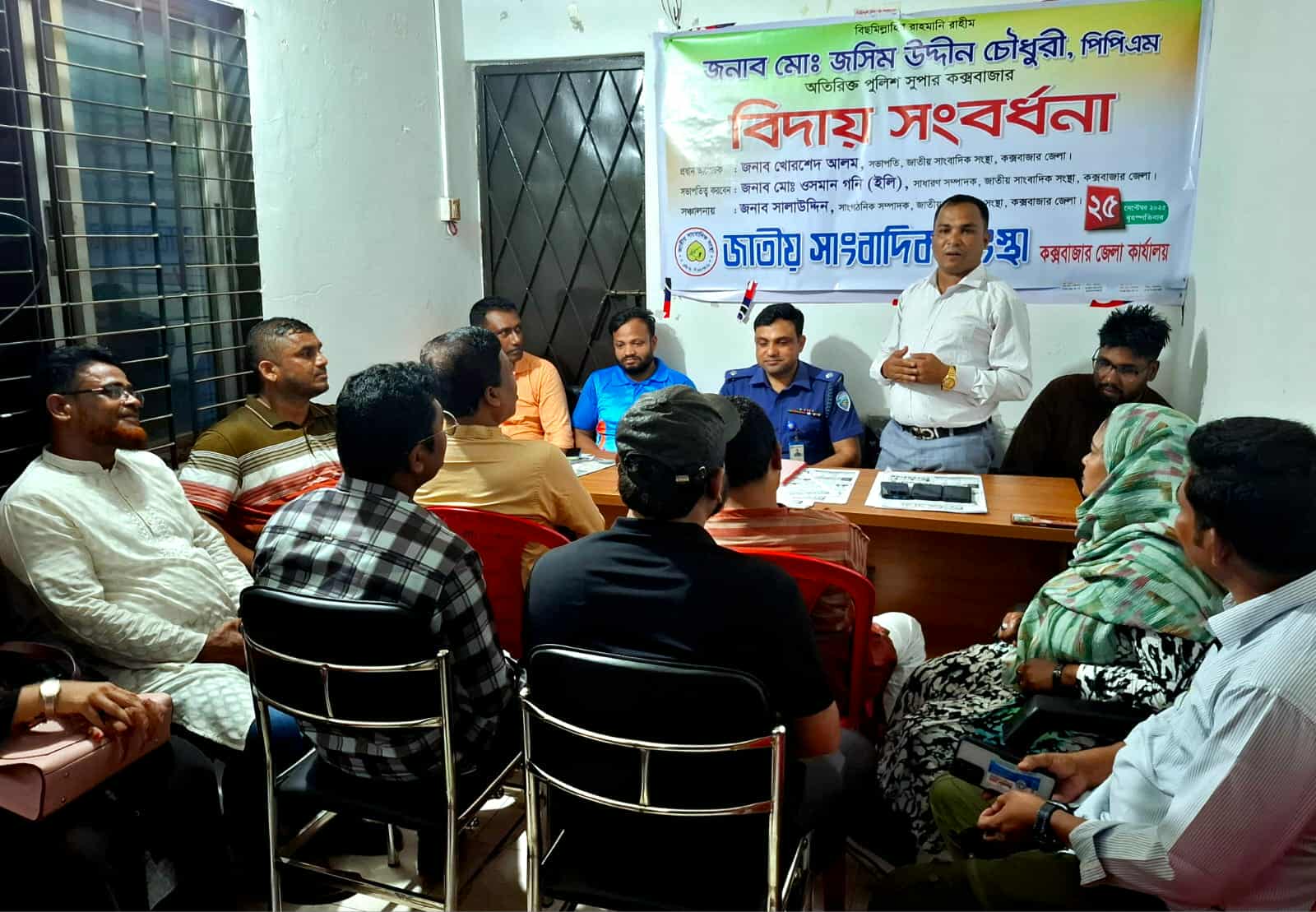 কক্সবাজার জেলার অন্তর্ভুক্ত কক্সবাজারর জেলাসহ উপজেলা কমিটির উপস্থিতিতে অতিরিক্ত পুলিশ সুপার (কক্সবাজার) জনাব মোঃ জসিম উদ্দিন চৌধুরী, পিপিএম-কে বিদায় সংবর্ধনা দিয়েছে জাতীয় সাংবাদিক সংস্থা। বৃহস্পতিবার (২৫ সেপ্টেম্বর ২০২৫) কক্সবাজার জেলা কার্যালয়ে এই বিদায় সংবর্ধনা অনুষ্ঠিত হয়।অনুষ্ঠানে প্রধান আলোচক হিসেবে বক্তব্য দেন জাতীয় সাংবাদিক সংস্থা কক্সবাজার জেলা শাখার সভাপতি খোরশেদ আলম। সভাপতিত্ব করেন সংগঠনের সাধারণ সম্পাদক মোঃ ওসমান গনি ইলি এবং অনুষ্ঠান সঞ্চালনা করেন সংগঠনের সাংগঠনিক সম্পাদক সালাউদ্দিন।সংবর্ধনা অনুষ্ঠানে জেলা কমিটির সহ-সাধারণ সম্পাদক আমানুল্লাহ আমান, অর্থ সম্পাদক নাছিমা আক্তার, দপ্তর সম্পাদক মোঃ আজিজ উল্লাহ ( আজিজ), প্রচার সম্পাদক রতন দাশ, সহ-সাংগঠনিক সম্পাদক মোঃ শওকত, মহেশখালী উপজেলা কমিটির সভাপতি হারুনুর রশীদ, , টেকনাফ উপজেলা কমিটির সভাপতি নুরুল হোসাইন, সাধারণ সম্পাদক ফরহাদ উখিয়া উপজেলা কমিটির সভাপতি কামরুন নেছা তানিয়া, রামু উপজেলা সভাপতি কায়সার কায়েদ আলম সহ সংগঠনের বিভিন্ন স্তরের নেতৃবৃন্দ উপস্থিত ছিলেন।বিদায়ী অতিথির বক্তব্য:বিদায়ী অতিরিক্ত পুলিশ সুপার মোঃ জসিম উদ্দিন চৌধুরী বলেন,“কক্সবাজারে দায়িত্ব পালনকালে আমি গণমাধ্যমকর্মীদের সহযোগিতা ও আন্তরিকতা পেয়েছি। আইনশৃঙ্খলা রক্ষায় সাংবাদিকদের ভূমিকা অগ্রণী। এই জেলায় কাজ করতে গিয়ে যেসব অভিজ্ঞতা অর্জন করেছি, তা আমার পেশাগত জীবনের বড় সম্পদ হয়ে থাকবে। আমি আশা করি ভবিষ্যতেও এ জেলার সাংবাদিক সমাজ সমাজের কল্যাণে কাজ করে যাবে এবং আইনশৃঙ্খলা রক্ষায় প্রশাসনকে সহযোগিতা করবে।অতিথিবৃন্দ বিদায়ী কর্মকর্তা জসিম উদ্দিন চৌধুরীর কর্মদক্ষতা, সততা ও আন্তরিকতার প্রশংসা করেন এবং তাঁর আগামীর দায়িত্ব পালনে সফলতা কামনা করেন।আগামী পথচলায়ও সততার সঙ্গে এগিয়ে যাবেন ইনশাআল্লাহ এই বলে বক্তব্য সমাপ্ত করেন।