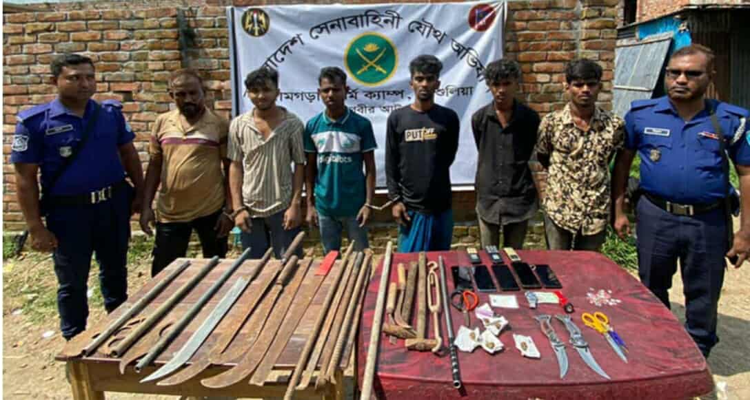 গ্রেপ্তারকৃতরা হলেন— ইয়ার হোসেন (২০), সোনা মিয়া (৪৫), আশরাফুল (৩৫), বড় বাবু (১৯), ছোট বাবু (১৭) ও আকাশ (১৮)। তাদের কাছ থেকে ১৬টি দেশীয় অস্ত্র, ৫টি ধারালো অস্ত্র, ৫ পট গাঁজা, ৮টি মোবাইল ফোন ও ৪৮টি সিম কার্ড উদ্ধার করে সেনাবাহিনী।