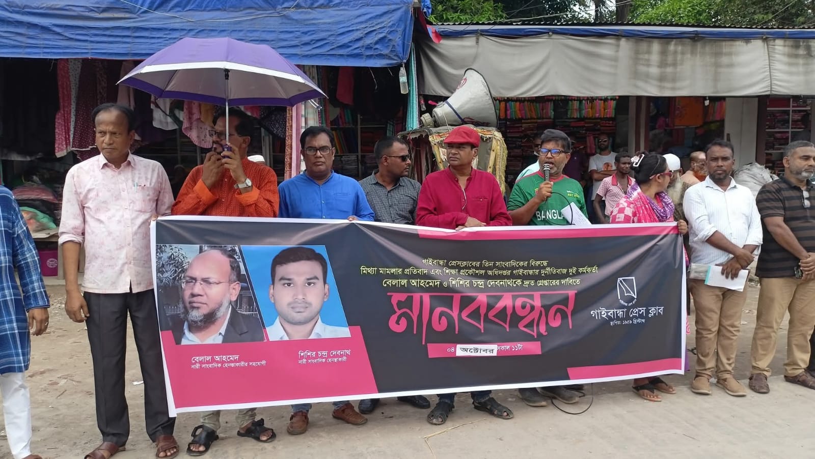 মোঃ মিঠু মিয়া,গাইবান্ধা প্রতিনিধি : গাইবান্ধা প্রেসক্লাবের তিন সাংবাদিকের বিরুদ্ধে দায়ের করা মিথ্যা মামলার প্রতিবাদ এবং শিক্ষা প্রকৌশল অধিদপ্তর, গাইবান্ধার দুর্নীতিবাজ দুই কর্মকর্তা বেলাল আহমেদ ও শিশির চন্দ্র দেবনাথকে দ্রুত গ্রেপ্তারের দাবিতে মানববন্ধন অনুষ্ঠিত হয়েছে।৪ঠা অক্টোবর রোজ: শনিবার সকালে ১১টা শহরের ডিবি রোডে গানাস মার্কেট সামনে মানববন্ধনের আয়োজন করা হয়। এতে স্থানীয় সাংবাদিক, সামাজিক সংগঠনের প্রতিনিধি, সাধারণ মানুষ অংশ নেন। বক্তারা বলেন, শিক্ষা প্রকৌশল অধিদপ্তরে ব্যাপক অনিয়ম-দুর্নীতি চলমান থাকলেও দুর্নীতিবাজ কর্মকর্তারা প্রশাসনিক প্রভাব খাটিয়ে নির্দোষ সাংবাদিকদের বিরুদ্ধে মিথ্যা মামলা দিয়েছে। তারা অবিলম্বে এ মামলা প্রত্যাহার ও সংশ্লিষ্ট দুই কর্মকর্তার দ্রুত গ্রেপ্তার দাবি জানান। মানববন্ধনে বক্তৃতা করেন গাইবান্ধা প্রেসক্লাবের বক্তারা আরও বলেন, দুর্নীতির বিরুদ্ধে কলম ধরার কারণে সাংবাদিকদের হয়রানি করা হচ্ছে। সংবাদপত্রের স্বাধীনতা রক্ষায় দেশের সচেতন নাগরিকদের এগিয়ে আসতে হবে।