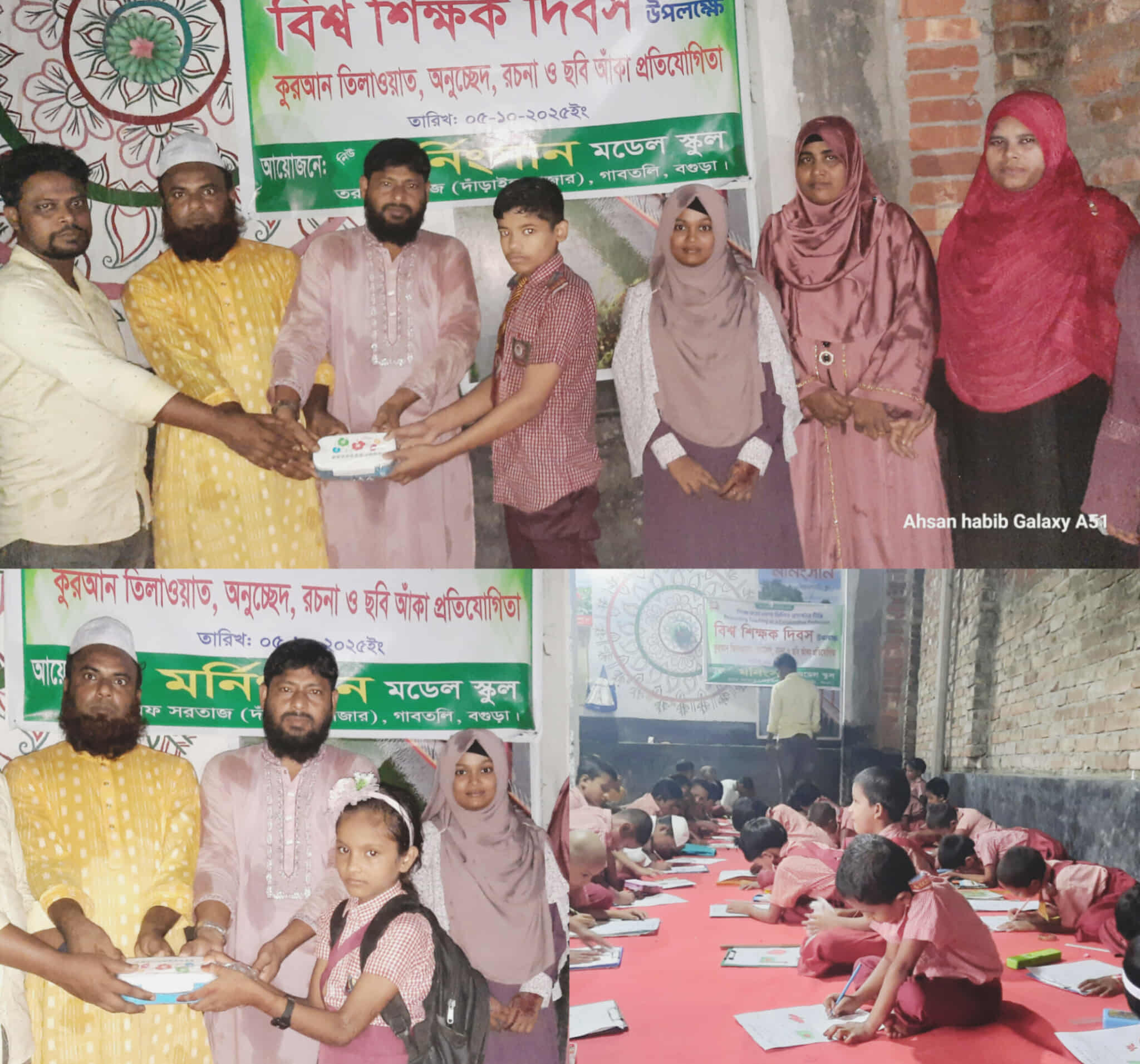 আহসান হাবিব শিবলু, বগুড়া প্রতিনিধি : শিক্ষকতা পেশা — মিলিত প্রচেষ্টার দীপ্তি এই প্রতিপাদ্যকে সামনে রেখে বিশ্ব শিক্ষক দিবস ২০২৫ উদযাপন করেছে গাবতলী উপজেলার তরফ সরতাজ (দাঁড়াইল বাজার) এলাকার নিউ মর্নিংসান মডেল স্কুল। রবিবার (০৫ অক্টোবর ২০২৫ইং) সকাল ১০টায় বিদ্যালয় প্রাঙ্গণে পবিত্র কুরআন তিলাওয়াতের মাধ্যমে অনুষ্ঠানের সূচনা হয়। এরপর শিক্ষার্থীদের অংশগ্রহণে অনুচ্ছেদ, রচনা ও ছবি আঁকা প্রতিযোগিতা অনুষ্ঠিত হয়। বিদ্যালয়ের পরিচালক গোলাম মোস্তফা বলেন, শিক্ষক দিবস আমাদের জন্য একটি অনুপ্রেরণার দিন। শিক্ষকরা সমাজের মূল চালিকাশক্তি, তাঁদের হাত ধরেই গড়ে ওঠে একটি শিক্ষিত জাতি। শিক্ষার্থীদের নৈতিকতা ও মানবিক গুণাবলি বিকাশে শিক্ষকদের অবদান অমূল্য। বিদ্যালয়ের সভাপতি মাহবুবুর রহমান মাফু (কাজী) বলেন, শিক্ষকতা শুধু একটি পেশা নয়, এটি সমাজ পরিবর্তনের অন্যতম মাধ্যম। আমাদের স্কুলের শিক্ষার্থীরা যেন একজন সৎ, নীতিবান ও মানবিক মানুষ হিসেবে গড়ে ওঠে — সেটাই আমাদের লক্ষ্য। বিদ্যালয়ের অধ্যক্ষ সেলিম রেজা বলেন,শিক্ষক দিবস শিক্ষার্থীদের মধ্যে শ্রদ্ধা, ভালোবাসা ও দায়বদ্ধতা তৈরি করে। আমরা চাই শিক্ষার্থীরা শিক্ষকদের প্রতি সম্মান দেখিয়ে জ্ঞান অর্জনের মাধ্যমে নিজেদের ভবিষ্যৎ উজ্জ্বল করুক। অনুষ্ঠানে আরও উপস্থিত ছিলেন ধর্মীয় শিক্ষক হাফেজ ক্বারী মাওলানা মোঃ আনোয়ার হোসেন, সহকারী শিক্ষকগণ সানি, ইলোরা আক্তার, জাকিয়া সুলতানা, নিলা আক্তার, রিক্তা, আক্তার, মোত্তাকিয়া, জান্নাতী আক্তার ও শ্রাবন। অভিভাবকদের মধ্যে উপস্থিত ছিলেন সাজেদুর রহমান সবুজ, সাবিহা আক্তার মনি, চাম্মা খাতুন, কামরুন নাহার পুতুল প্রমুখ। প্রতিযোগিতা শেষে বিজয়ীদের হাতে পুরস্কার তুলে দেওয়া হয়। বক্তারা বলেন, শিক্ষা ও শিক্ষকের মর্যাদা রক্ষায় সবাইকে সম্মিলিতভাবে কাজ করতে হবে। দিনব্যাপী আয়োজনটি ছিল উৎসবমুখর পরিবেশে পরিপূর্ণ।