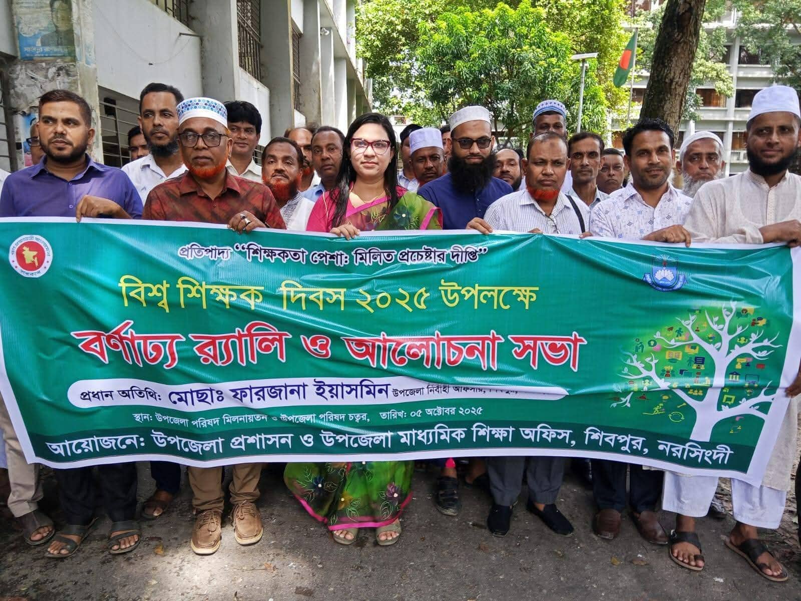 মোঃ কামাল হোসেন প্রধান, জেলা প্রতিনিধি নরসিংদীঃ নরসিংদীর শিবপুরে বিশ্ব শিক্ষক দিবস উদযাপন করা হয়েছে। অদ্য ৫ই অক্টোবর রবিবার সকালে বিশ্ব শিক্ষক দিবস উদযাপন উপলক্ষে উপজেলা পরিষদ মাঠ থেকে একটি রেলী বের যা হয়েছে। তারপর শিবপুর উপজেলা পরিষদ সভা কক্ষে আলোচনা সভা অনুষ্ঠিত হয়। উপজেলা প্রশাসন ও উপজেলা মাধ্যমিক শিক্ষা অফিস এর যৌথ আয়োজনে রেলী ও আলোচনা সভা অনুষ্ঠিত হয়।সভায় প্রধান অতিথির হিসেবে বক্তব্য রাখেন শিবপুর উপজেলা নির্বাহী অফিসার মোছাঃ ফারজানা ইয়াসমিন।উপস্থিত ছিলেন উপজেলা মাধ্যমিক শিক্ষা অফিসার মোঃ আলতাফ হোসেন, একাডেমিক সুপারভাইজার মোঃ গিয়াস উদ্দিন,বিভিন্ন প্রমুখ। এছাড়াও শিক্ষা প্রতিষ্ঠান এর প্রধান শিক্ষক ও সহকারী শিক্ষক ও অন্যান্য নেতৃবৃন্দ এ সময় উপস্থিত ছিলেন।
