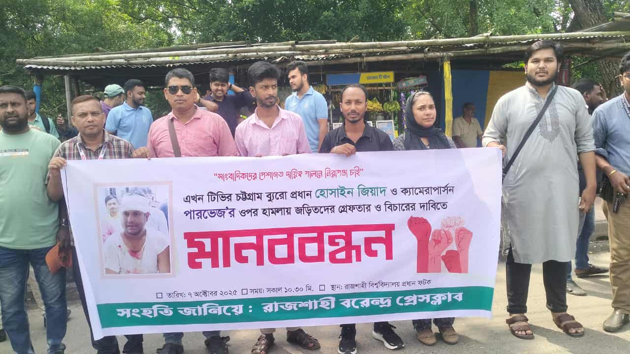 চট্টগ্রামের সীতাকুণ্ডের সলিমপুরে সংবাদ সংগ্রহ করতে গিয়ে এখন টেলিভিশনের চট্টগ্রাম ব্যুরো প্রধান হোসাইন জিয়াদ ও চিত্র সাংবাদিক পারভেজসহ তিন সাংবাদিকের ওপর হামলার ঘটনায় জড়িতদের দ্রুত গ্রেপ্তারের দাবিতে রাজশাহীতে মানববন্ধন অনুষ্ঠিত হয়েছে।
