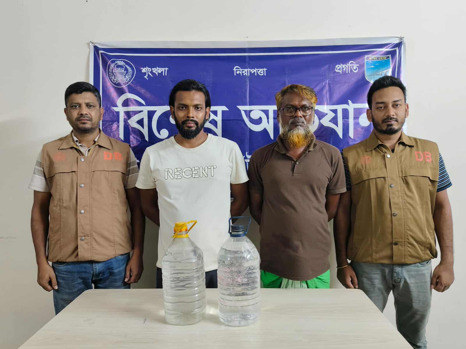 ঢাকা জেলার ডিবি (উত্তর) এর বিশেষ অভিযানে ১০ (দশ) লিটার চোলাই মদসহ দুই মাদক ব্যবসায়ীকে গ্রেফতার করেছে পুলিশ।