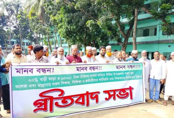২০ শতাংশ বাড়ি ভাড়া, ১৫০০ টাকা চিকিৎসা ভাতা এবং কর্মচারীদের জন্য ৭৫ শতাংশ উৎসব ভাতা বাস্তবায়নের দাবিতে ও শিক্ষকদের উপর হামলা, নির্যাতনের প্রতিবাদে পাবনার সাঁথিয়ায় সকল স্কুল, কলেজ ও মাদ্রাসা শিক্ষক-শিক্ষিকা ও কর্মচারীদের কর্ম বিরতি, মানববন্ধন ও প্রতিবাদ সভার আয়োজন করা হয়।